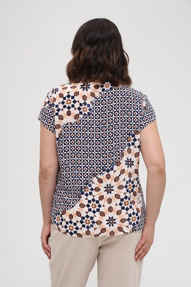 Блуза имеет короткие рукава и округлый вырез горловины, который дополнен небольшими складками, создающими легкий объем. Привлекает внимание яркий геометрический принт, выполненный в сочетании синего, белого и коричневого цветов.