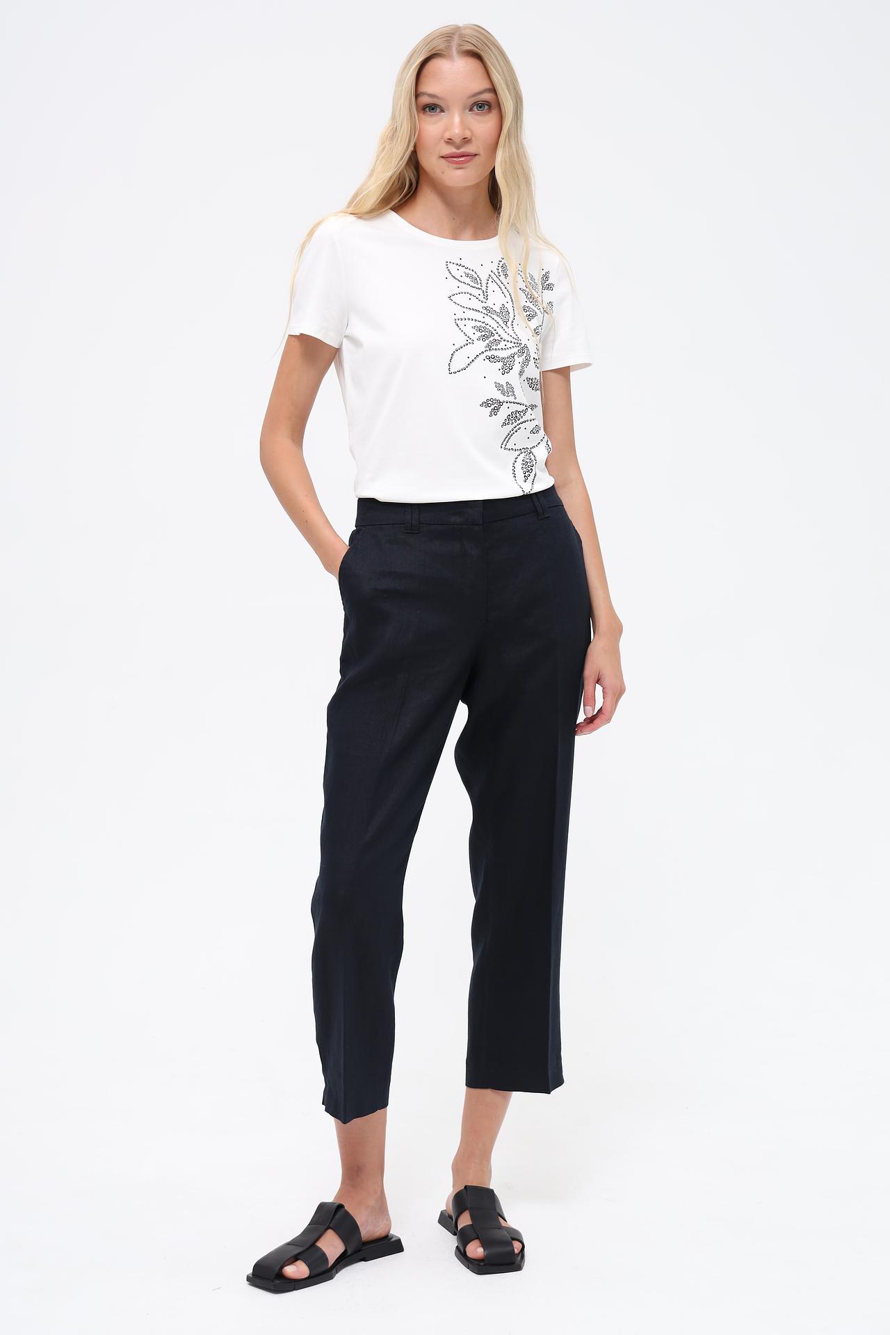 - Крой: Прямые брюки до середины икры с классической посадкой. Универсальный фасон подходит для любого типа фигуры.