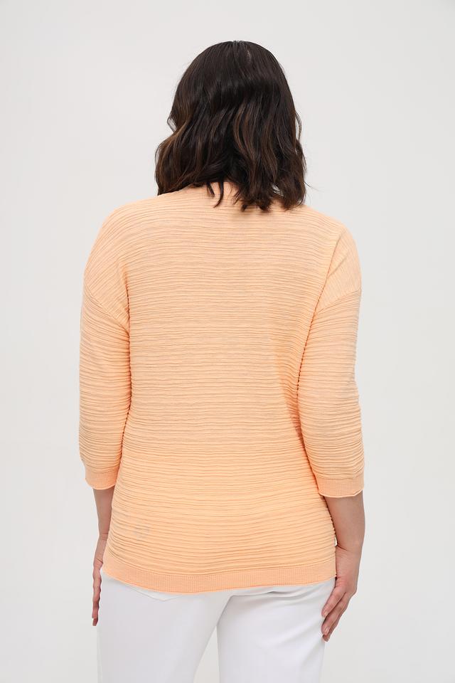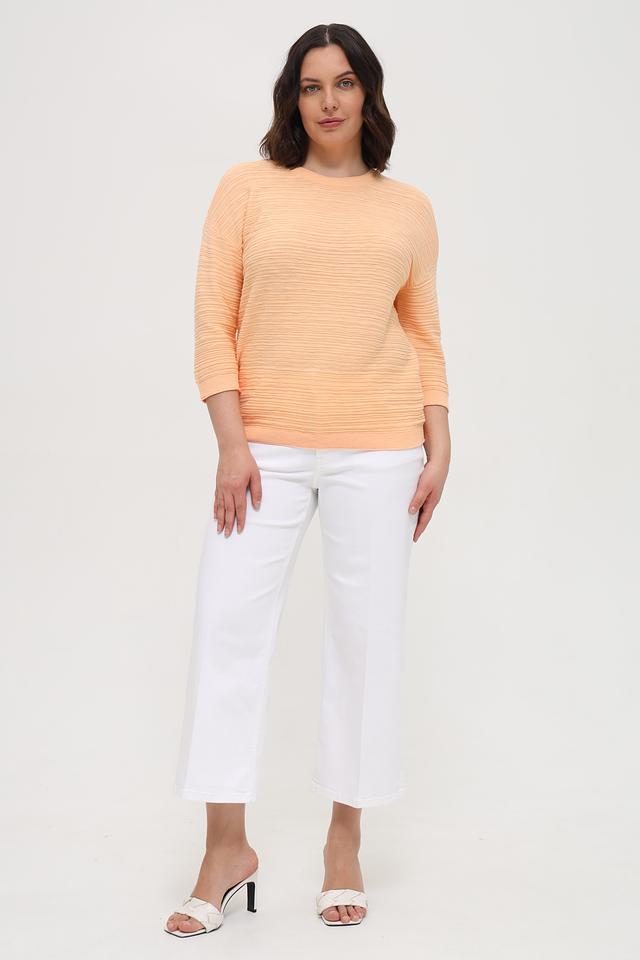 Модель имеет классический крой с округлым вырезом горловины и рукавами три четверти. Особое внимание привлекает текстурная вязка, которая создает объемный эффект и добавляет изделию изысканности. Пуловер идеально подойдет для создания как повседневных, так и более элегантных образов.