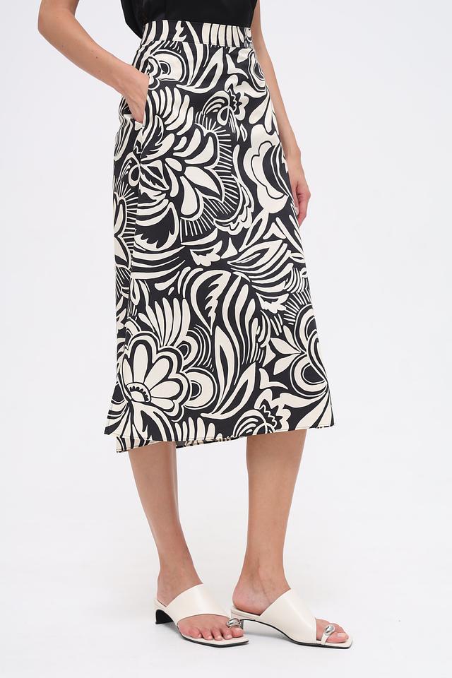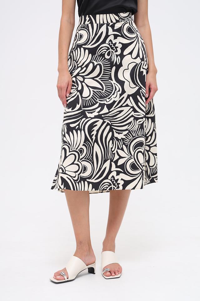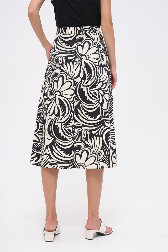 Основной цвет юбки – чёрный, но её украшает эффектный белоснежный принт в виде крупных цветов и абстрактных узоров. Такой рисунок делает эту модель особенно привлекательной и запоминающейся.