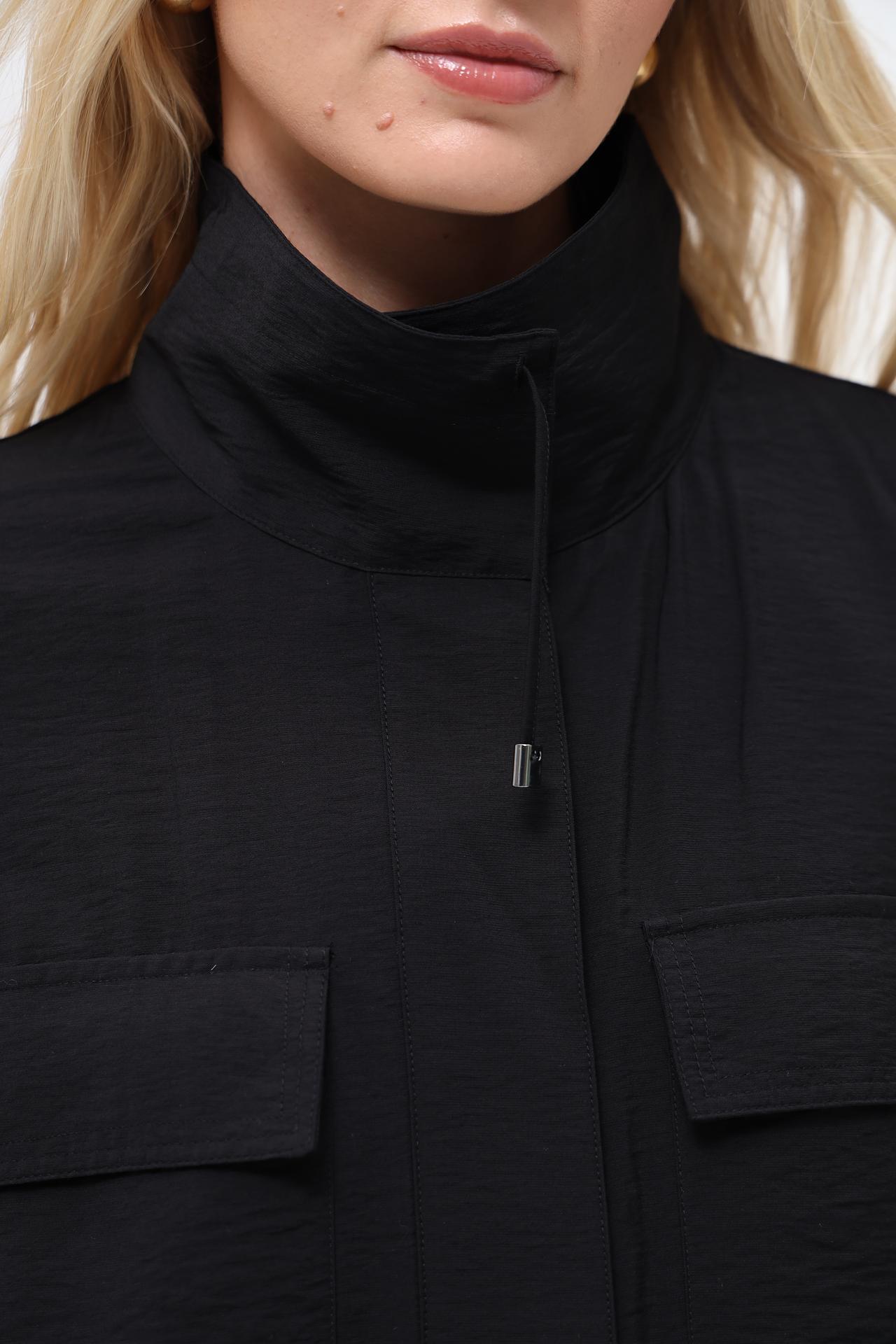 - Дизайн: Классический крой с современными деталями, такими как накладные карманы и регулируемый воротник-стойка, придают изделию актуальность. Металлические детали подчеркивают стиль милитари, делая образ более дерзким.