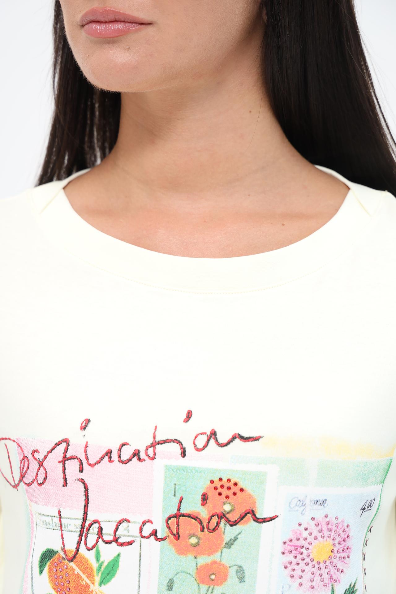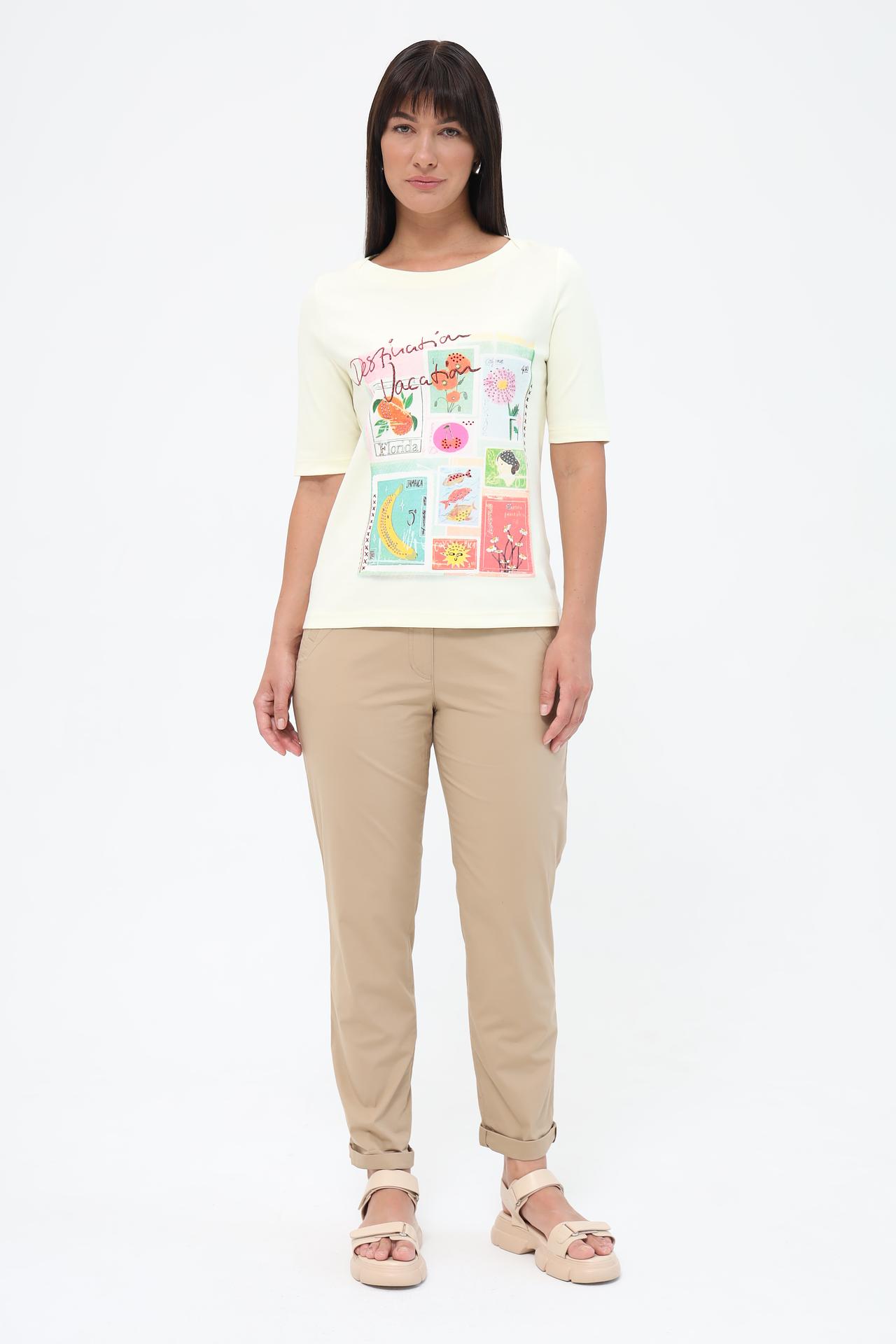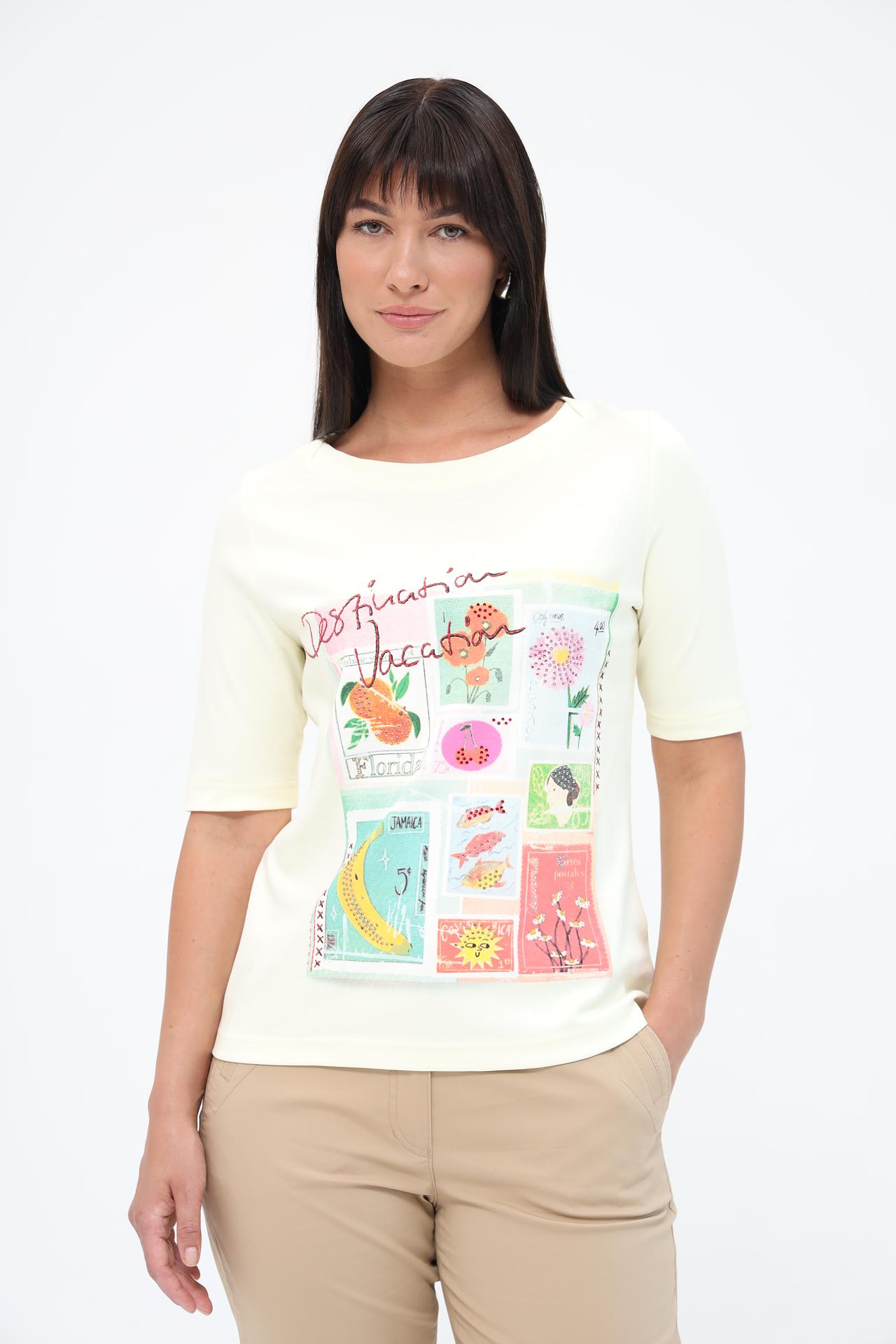 Очаровательная женская футболка Gerry Weber, выполненная из 100% хлопка, – идеальный выбор для создания лёгкого и непринужденного образа. Мягкий и дышащий хлопок обеспечивает комфорт в течение всего дня. Оригинальный принт с мотивами почтовых марок добавляет футболке уникальности и делает её запоминающейся деталью вашего гардероба. Эта футболка станет прекрасным дополнением к вашему повседневному стилю, добавив нотку свежести и позитива.