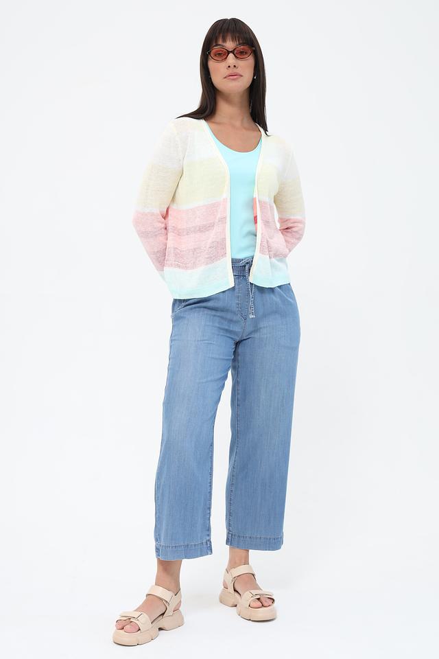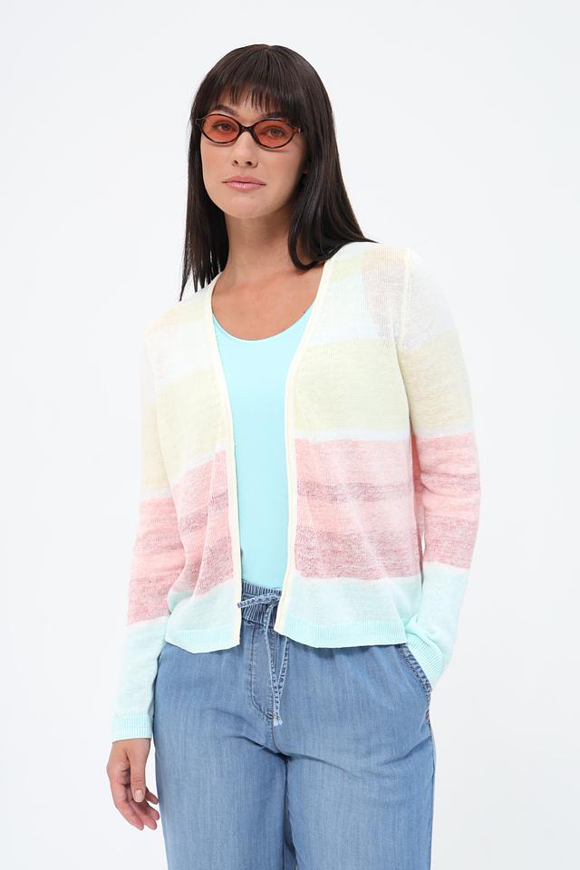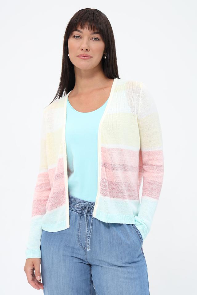 Жакет Gerry Weber нежно-розового цвета с ярким полосатым узором станет стильным дополнением к вашему образу. Модель выполнена из лёгкого трикотажа, идеально подходящего для тёплой погоды. Состав: лен 65%, хлопок 35%