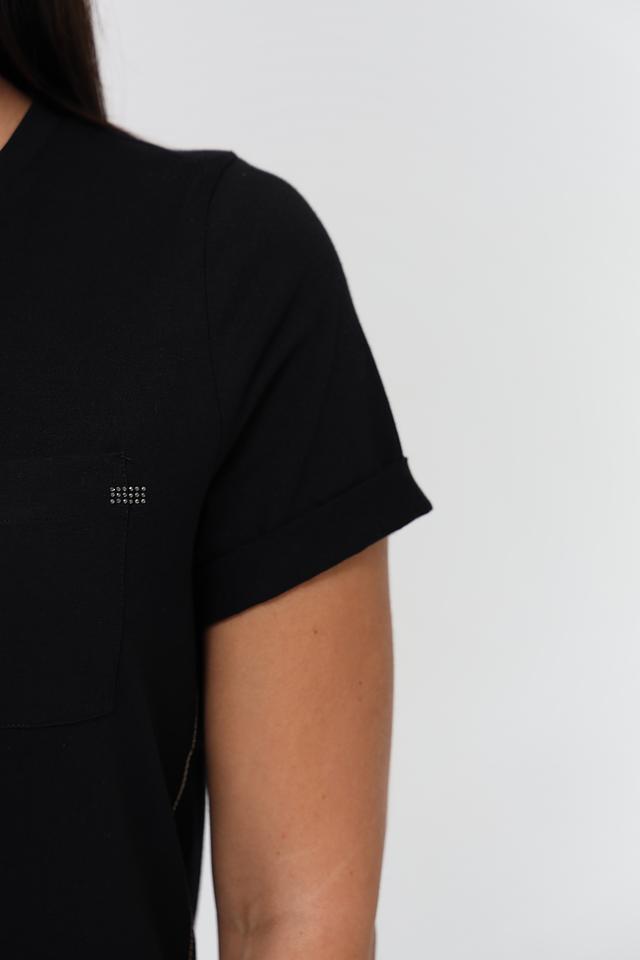 Классический прямой крой футболки подходит для любого типа фигуры. Короткие рукава делают её идеальным выбором для тёплой погоды. На груди и рукаве расположены небольшие декоративные элементы, добавляющие изысканности.