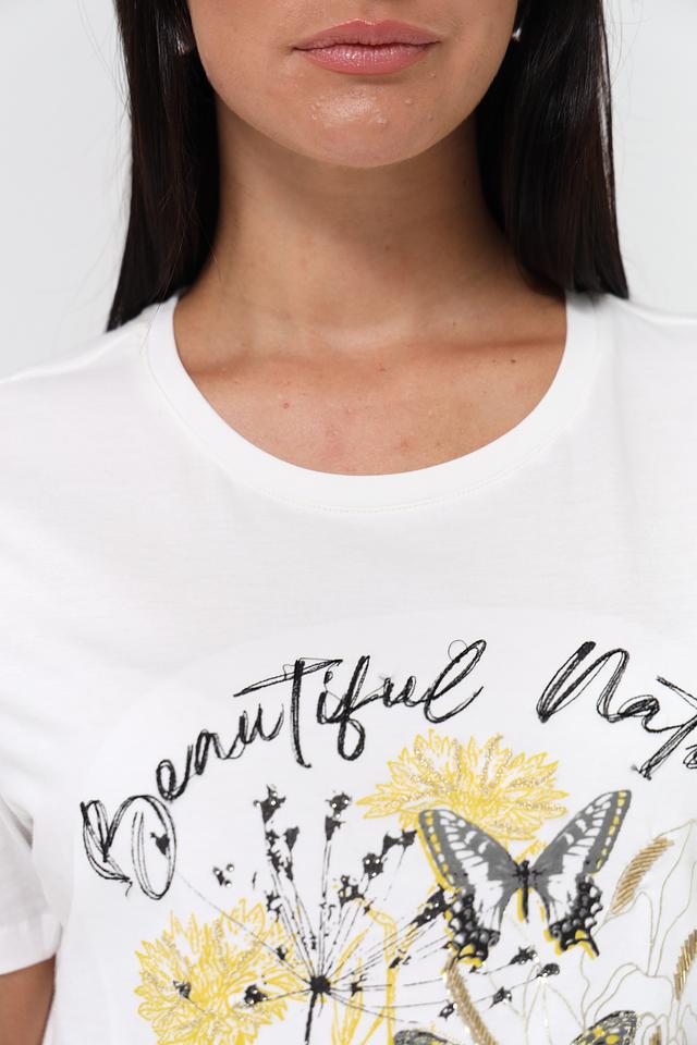 Особенностью данной модели является яркий принт с изображением бабочек и цветов, а также надпись "Beautiful Nature". Этот принт добавляет футболке легкости и свежести, делая ее идеальной для летних прогулок и повседневной носки.