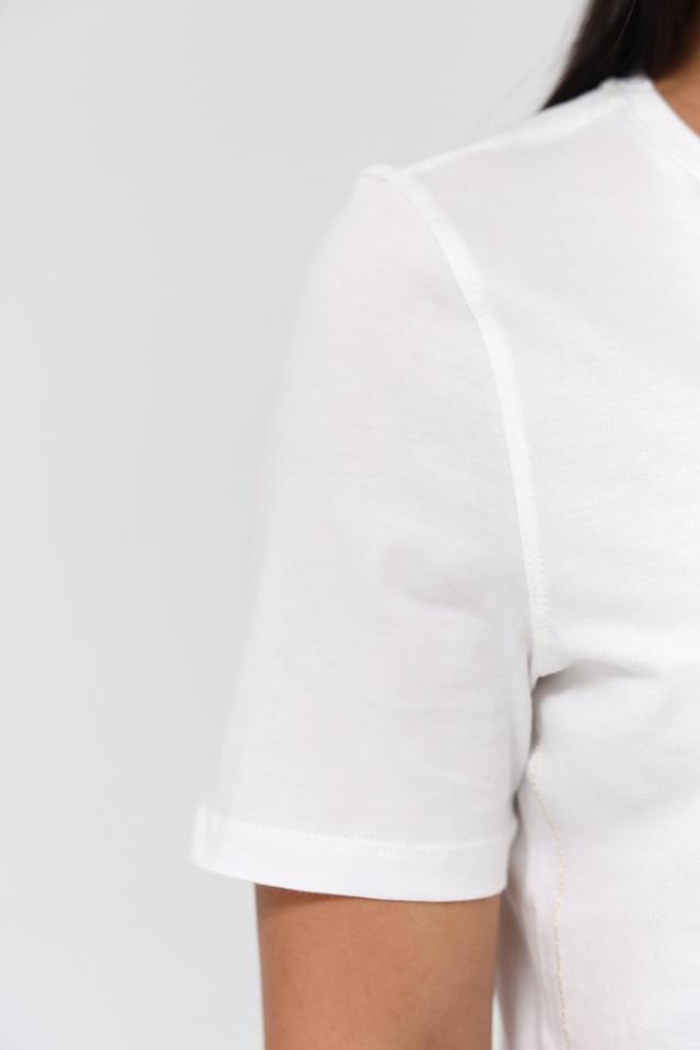 Круглый вырез горловины и короткие рукава обеспечивают свободу движений. Футболка имеет прямой крой, который подходит для большинства типов фигур. На спине расположен небольшой принт в виде бабочки, что добавляет изысканности.