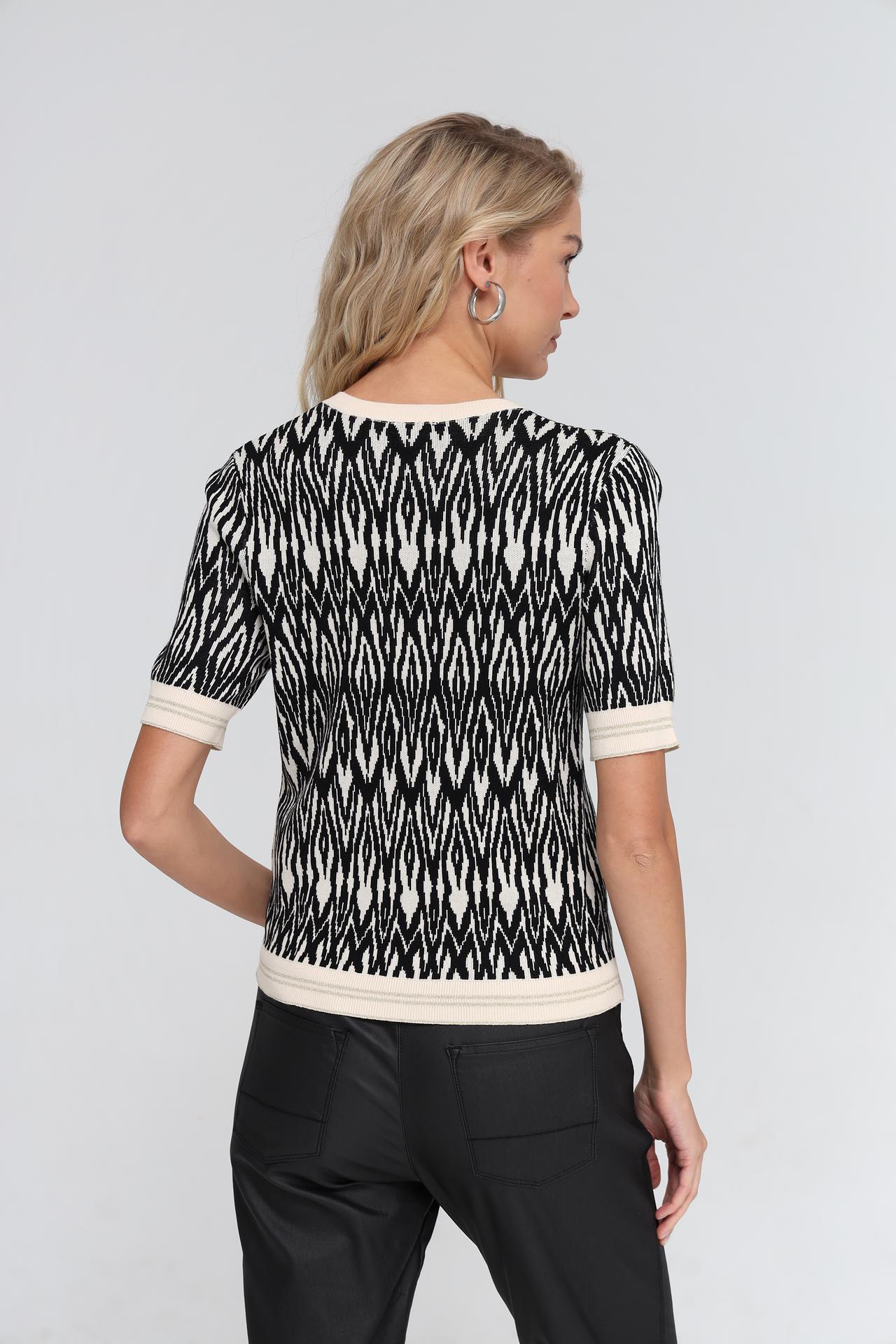 - Выразительный принт. Черно-бежевый графический узор добавляет образу динамики и характера, позволяя легко сочетать пуловер с однотонными брюками или юбками.