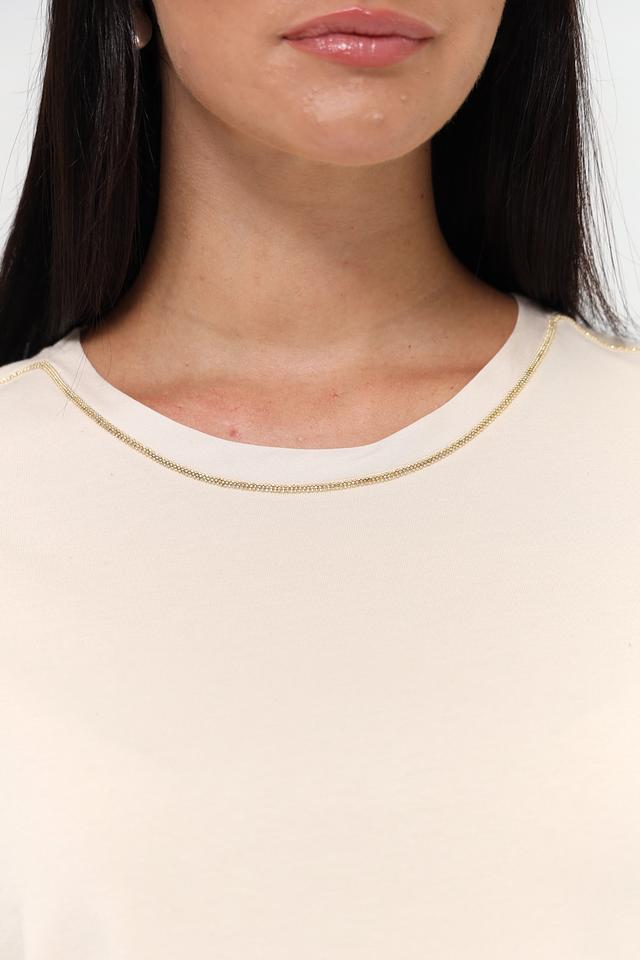 Декоративная отделка в виде золотистой цепочки у горловины придает футболке изысканность и оригинальность. Эта деталь делает модель более интересной и привлекательной.