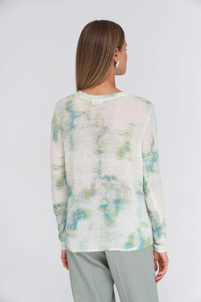 Женский пуловер Gerry Weber светло-зелёного цвета с оригинальным принтом в виде разводов. Изготовлен из мягкой смеси полиакрила, полиамида, шерсти и альпаки. Состав: полиакрил 45%, полиамид 30%, шерсть 15%, альпака 10%