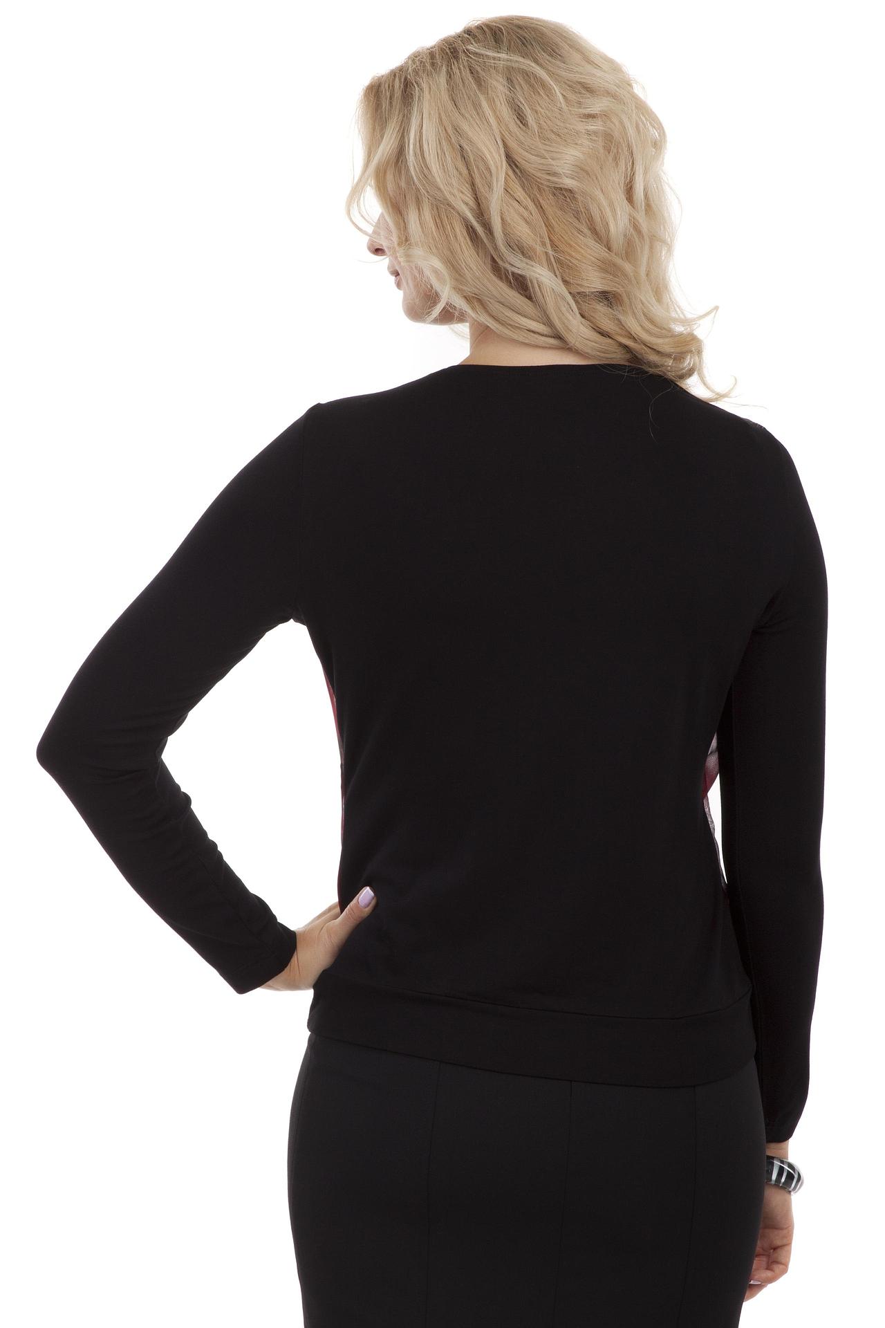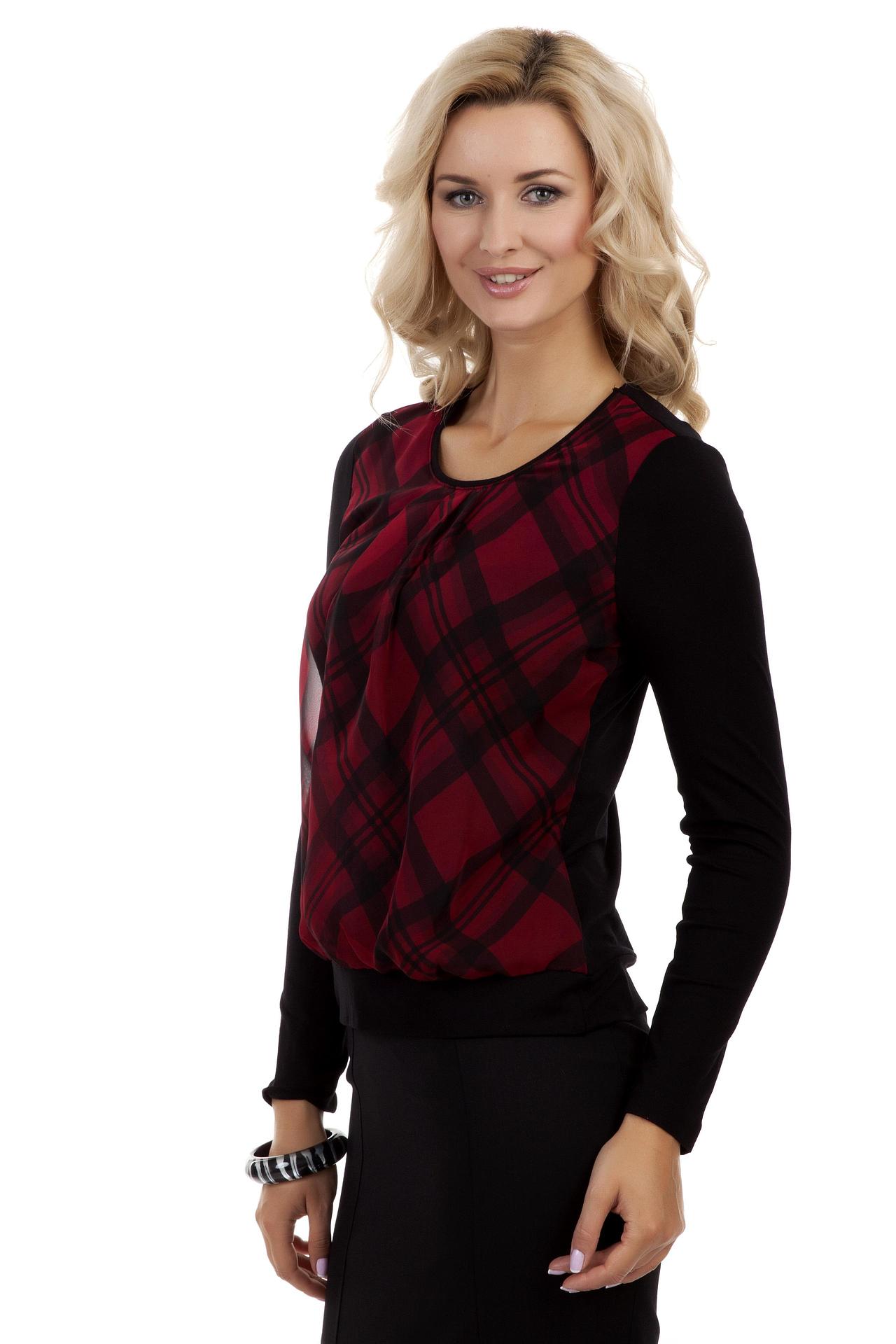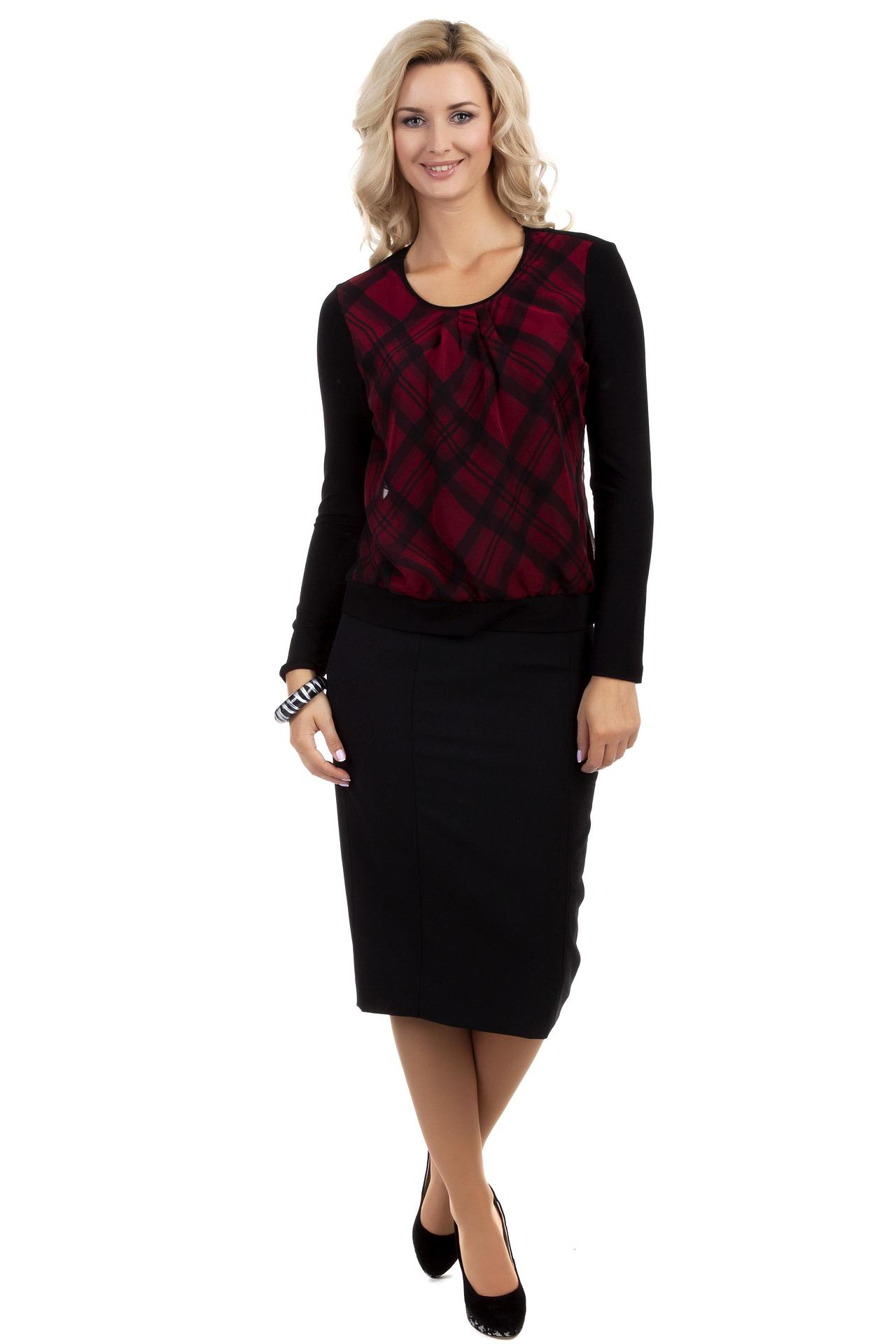 Черная сзади и в красную клетку спереди блуза из вискозы сделает вашу фигуру изящней. Такая блуза сделает ваш лук ярким и неординарным. Благодаря небольшим складкам у воротника, блуза не выглядит излишне просто. Особенно удачным выбором такая блуза будет для женщин за 40, чьи руки принято скрывать. Полупрозрачность блузы придаст вашему облику ненавязчивой пикантности.