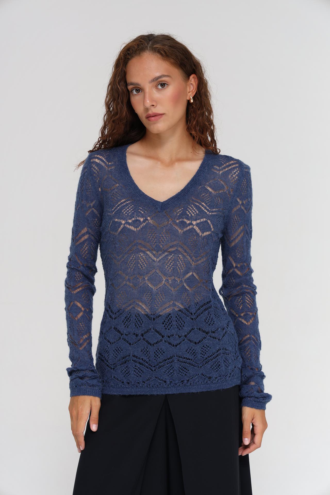 Синий ажурный пуловер Gerry Weber с V-образным вырезом