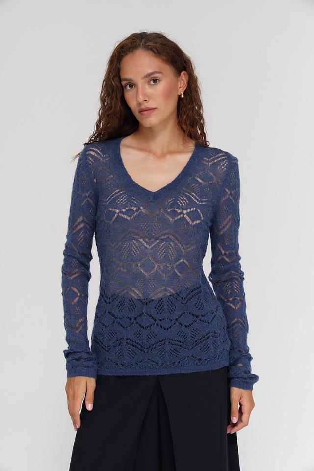 Пуловер имеет классический синий цвет и ажурный узор, который придает ему легкость и воздушность. V-образный вырез подчеркивает линию шеи, а длинные рукава обеспечивают дополнительное тепло в прохладную погоду.