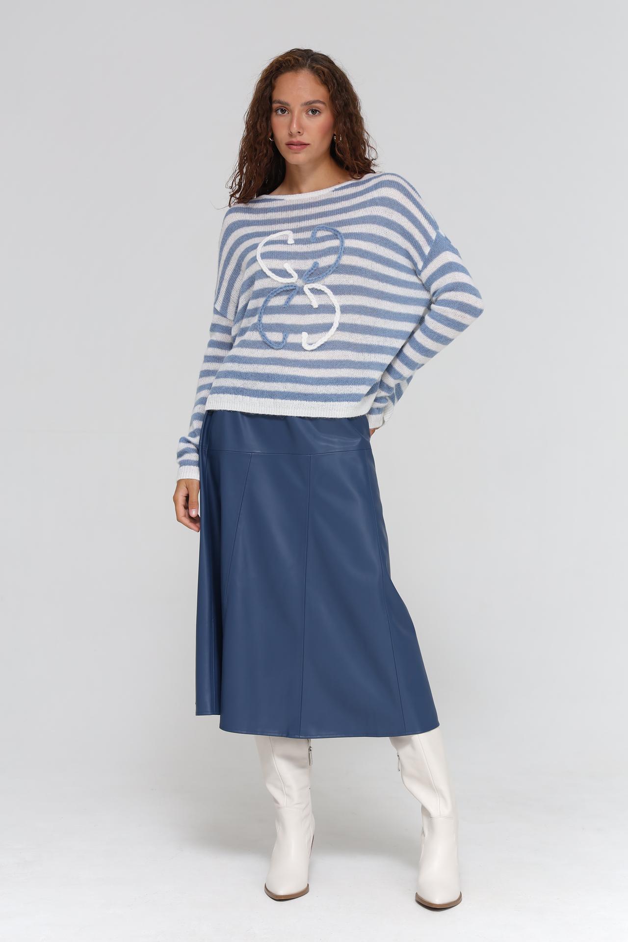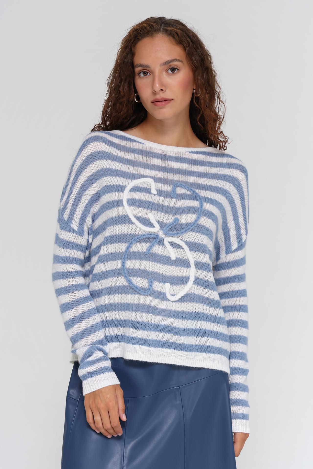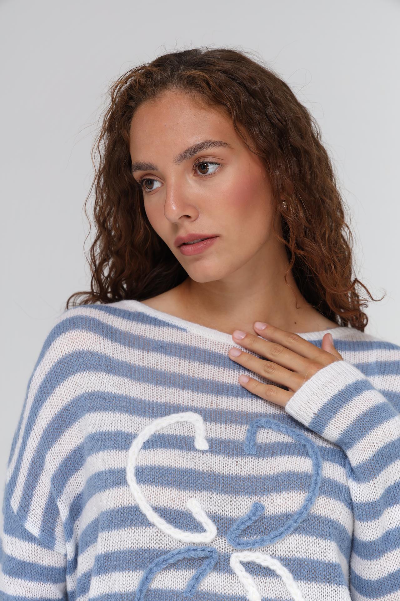 - Стильный дизайн: Классический полосатый принт в актуальных цветах дополнен оригинальным объемным декором, что придает пуловеру особую изюминку. Этот женский джемпер легко интегрируется в модные образы.
