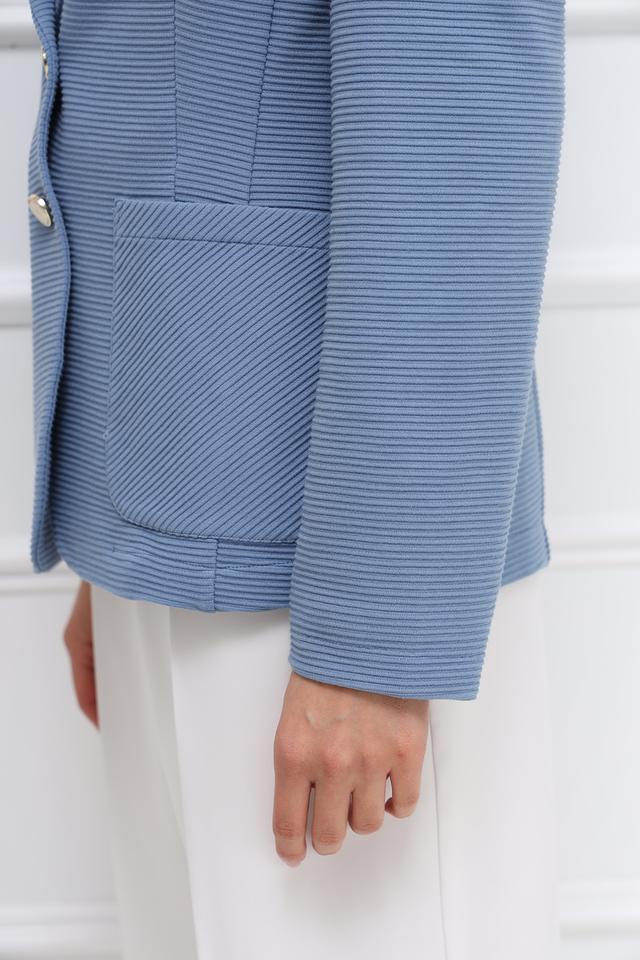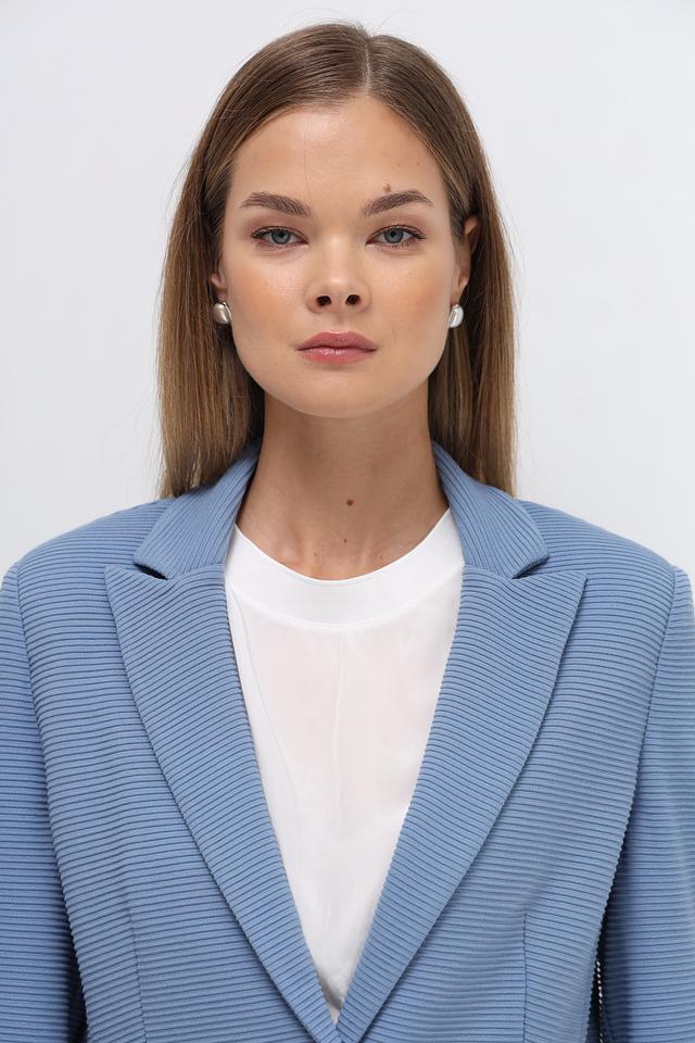 Жакет имеет классический крой с лацканами, застегивается на две пуговицы в тон изделия. Два функциональных кармана с клапанами добавляют практичности. Текстурированная ткань придает жакету особый шарм и визуальный интерес.