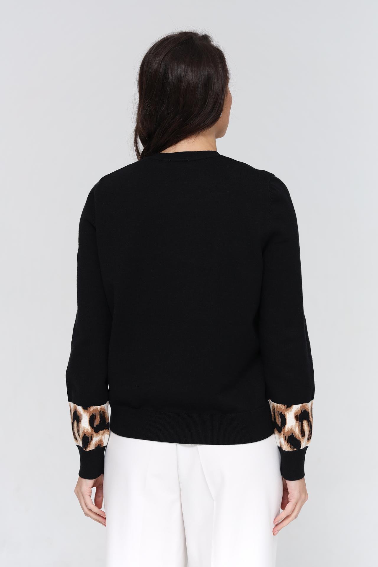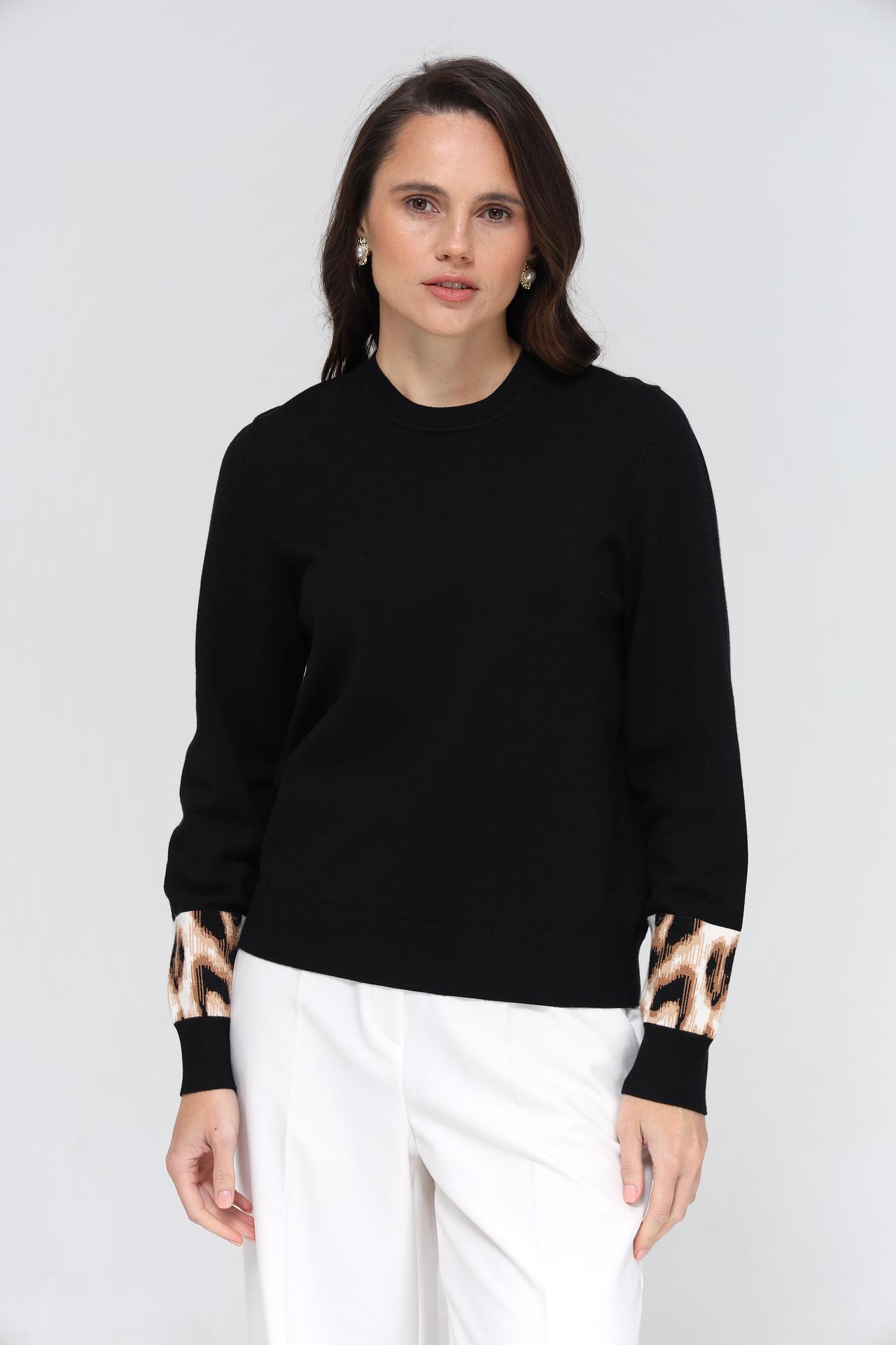 - Дизайн: Классический черный пуловер с круглым вырезом и длинными рукавами. Акцент в виде манжет с леопардовым принтом придает модели выразительность и модный акцент.
