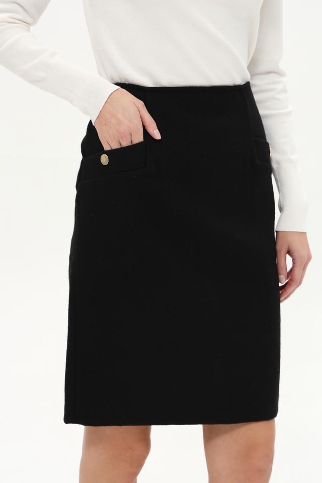 Чёрный цвет юбки позволяет легко сочетать её с различными элементами гардероба. Модель дополнена аккуратными боковыми карманами с декоративной золотистой пуговицей, что придаёт ей особый шарм. Застежка – молния сзади.