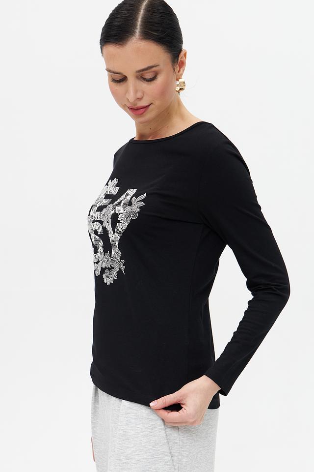 Основным акцентом является эффектный цветочный принт, выполненный в бело-серебристой гамме, придающий образу женственность и изысканность. Футболка имеет удобный крой и длинные рукава, что делает её идеальным выбором для прохладной погоды.