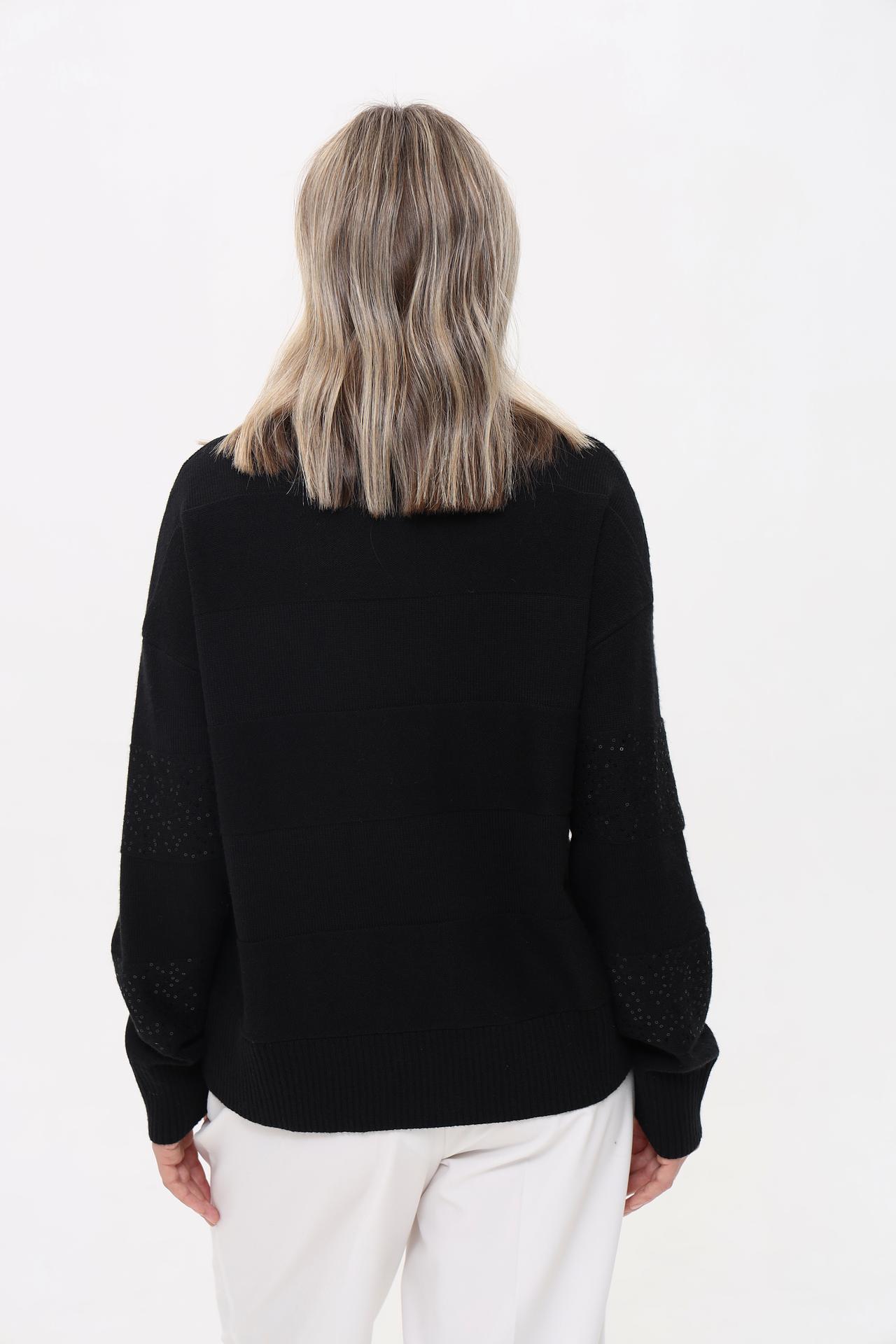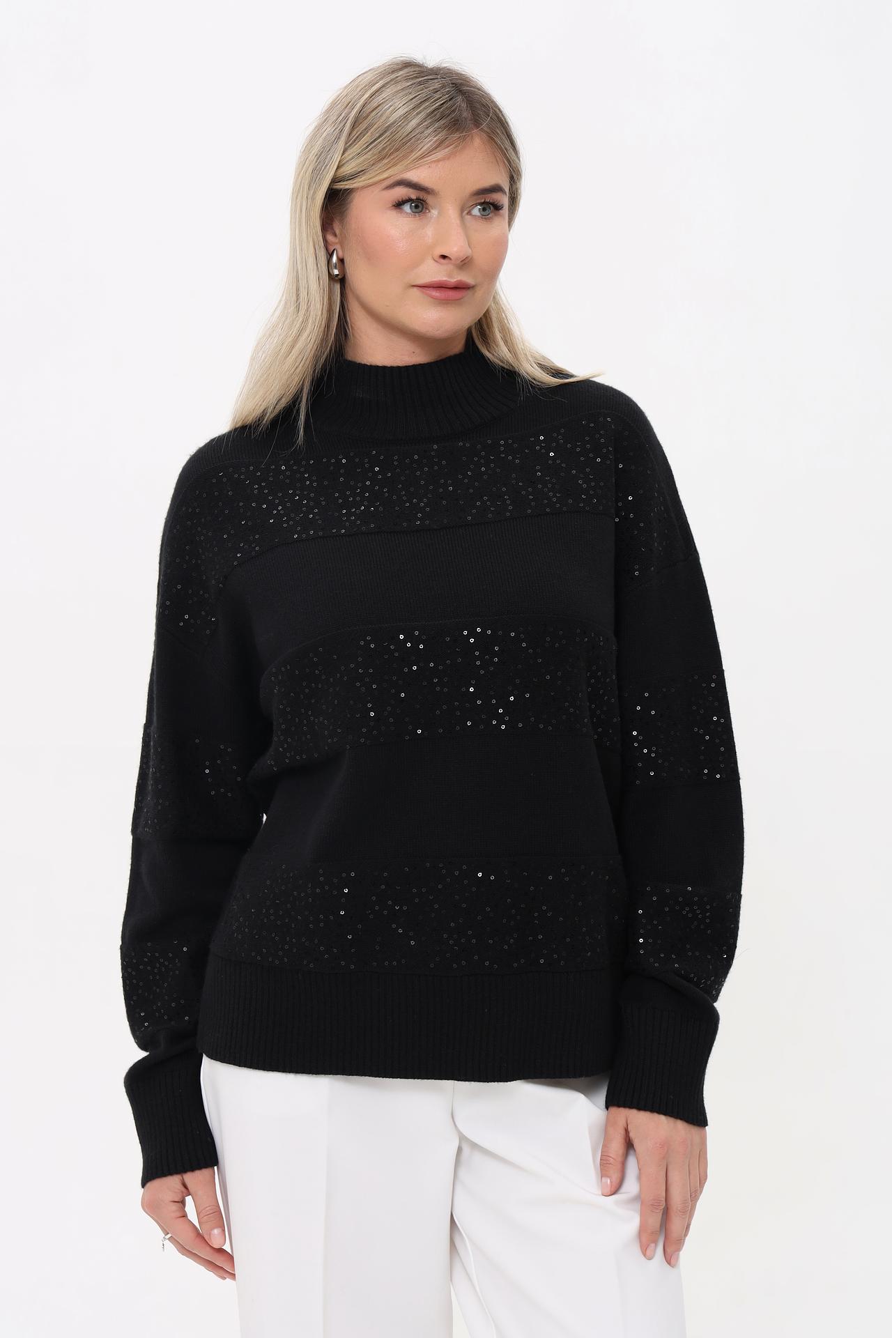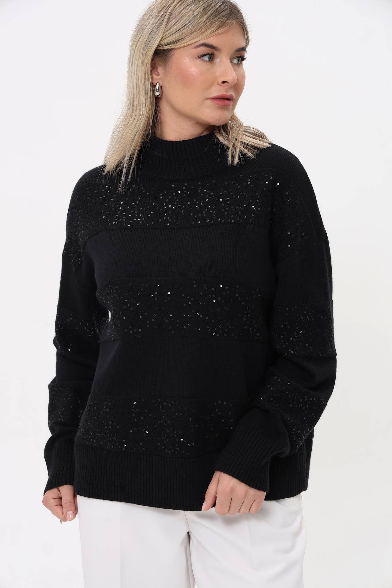 - Дизайн: Эффектные горизонтальные полосы с мерцающими пайетками создают изысканный акцент. Классический черный цвет делает пуловер универсальным элементом гардероба, легко сочетающимся с различными предметами одежды.