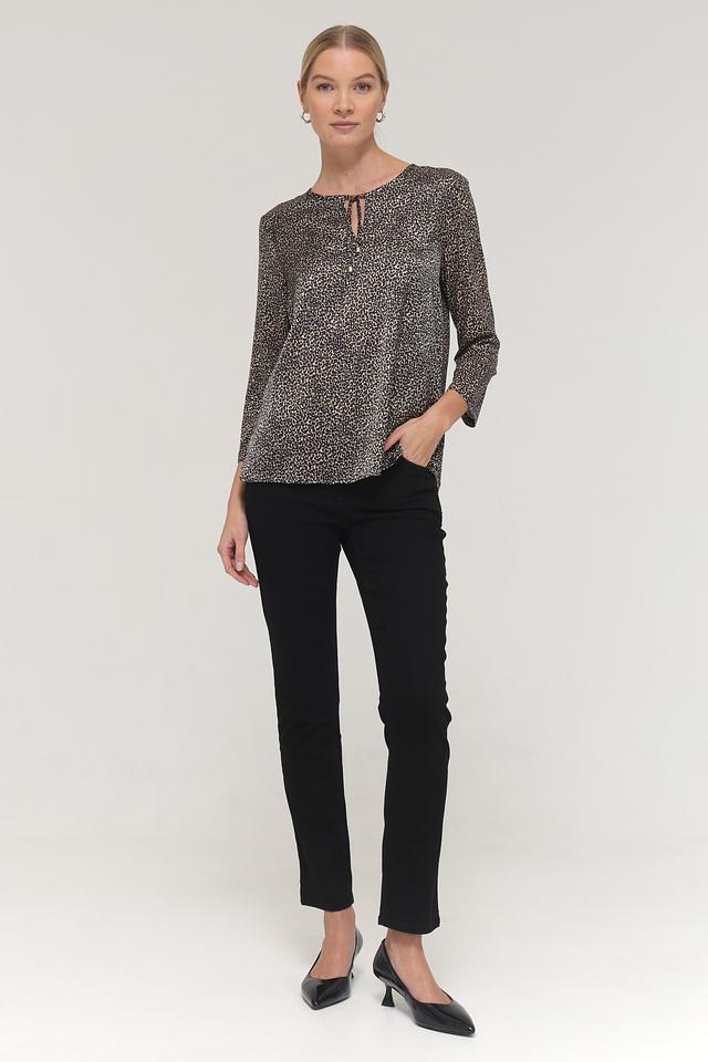 Джинсы имеют прямой, слегка зауженный к низу силуэт (Slim Fit), который подчеркивает фигуру, не сковывая движений. Высокая посадка обеспечивает комфорт и поддержку. Ткань состоит из хлопка (84%), полиэстера (15%) и эластана (1%), что обеспечивает удобство в носке, износостойкость и небольшую эластичность.