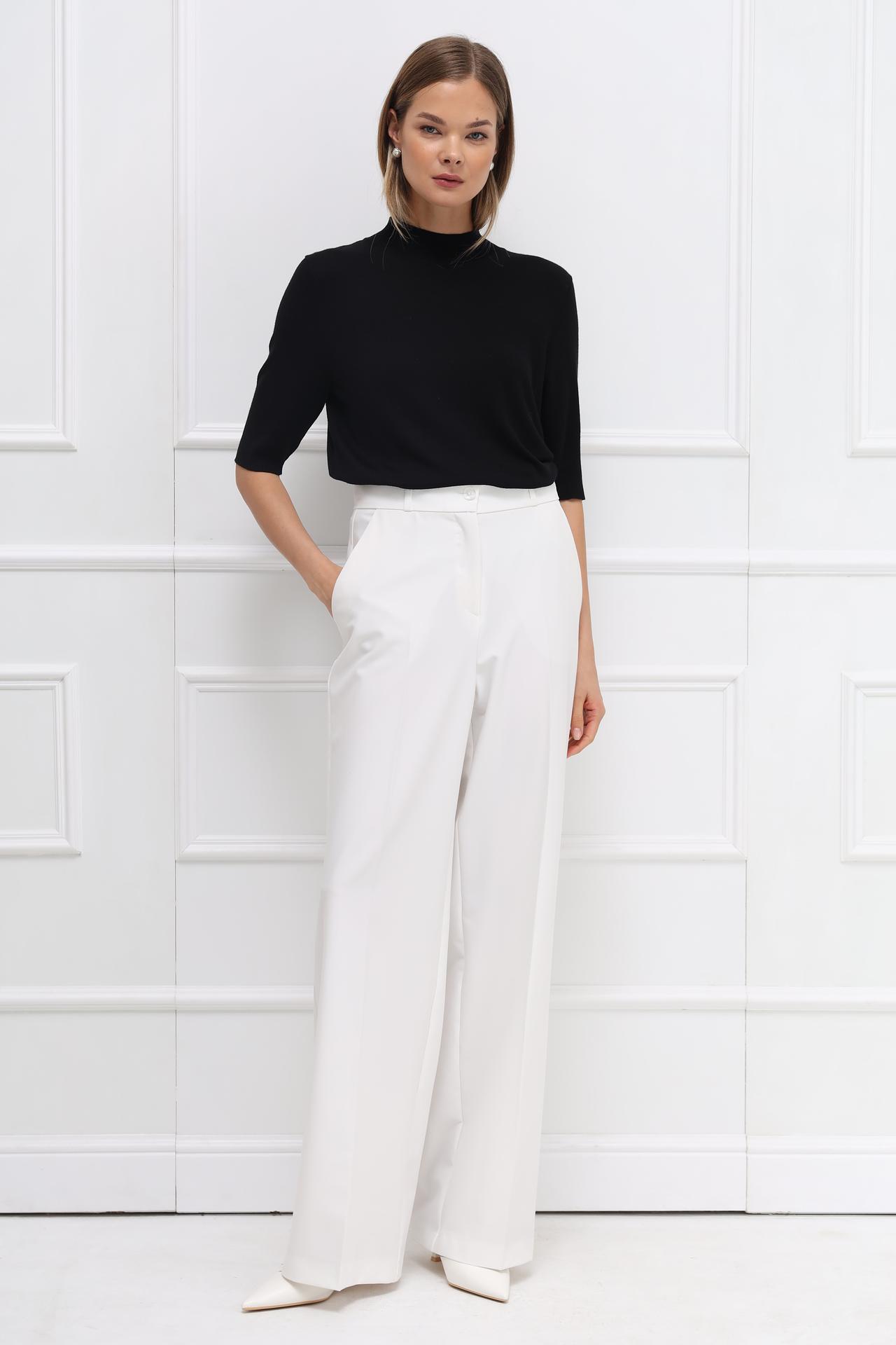 - Дизайн: Классический чёрный пуловер с высоким воротом и коротким рукавом. Модель прекрасно садится по фигуре, подчеркивая женственность силуэта.