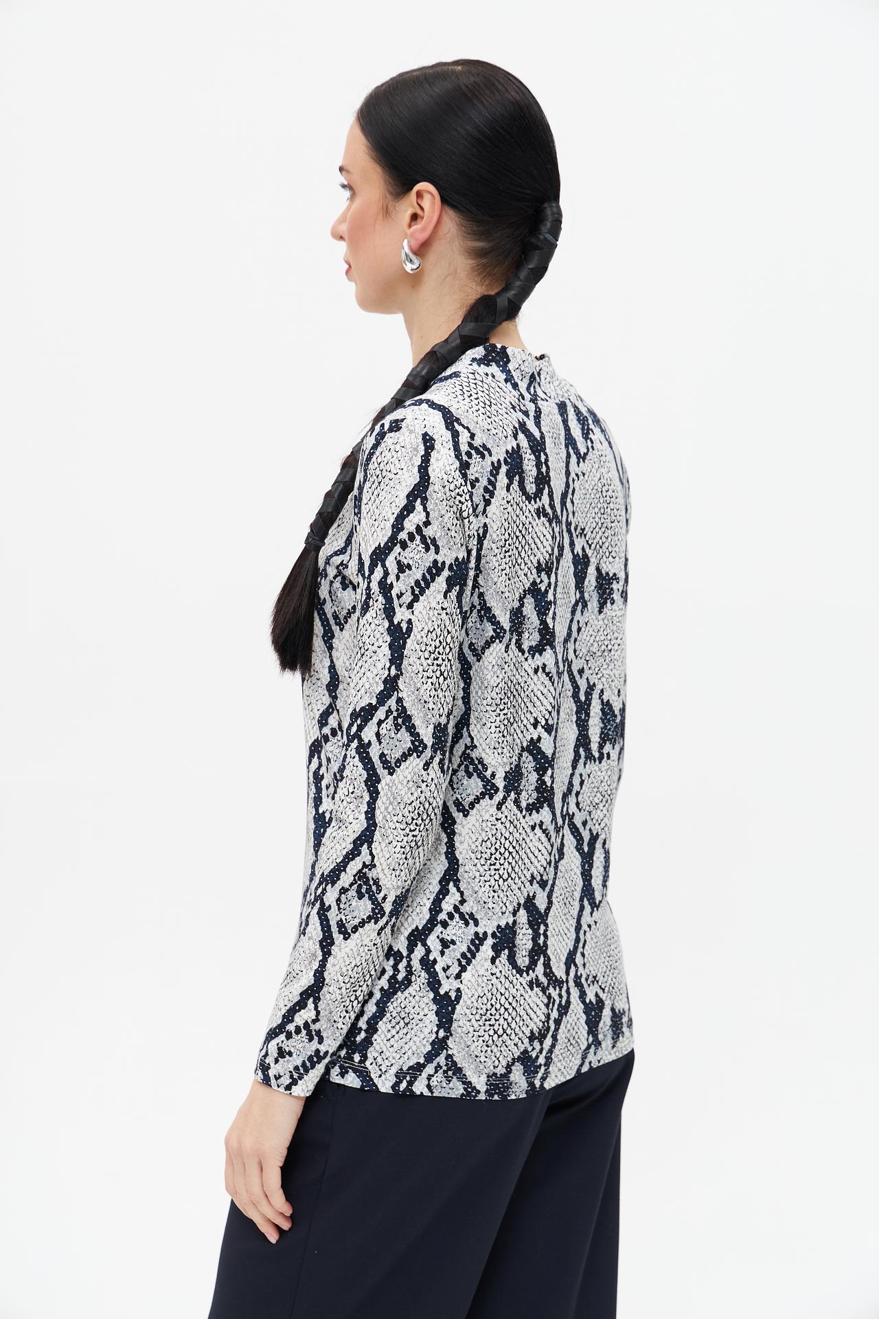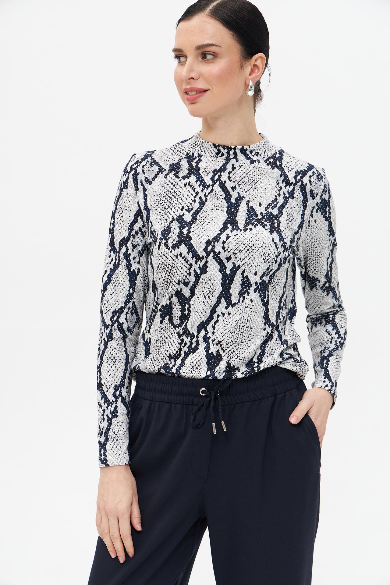 Элегантная футболка Gerry Weber с длинным рукавом выполнена из высококачественного смесового трикотажа, предлагая идеальное сочетание комфорта и современного стиля. Модель украшена эффектным змеиным принтом в серо-белых тонах с синими акцентами, что делает её ярким акцентом в любом гардеробе. Изделие обеспечивает превосходную посадку по фигуре, подчеркивая её достоинства без сковывания движений, и идеально подходит для создания как деловых, так и кэжуал-образов.