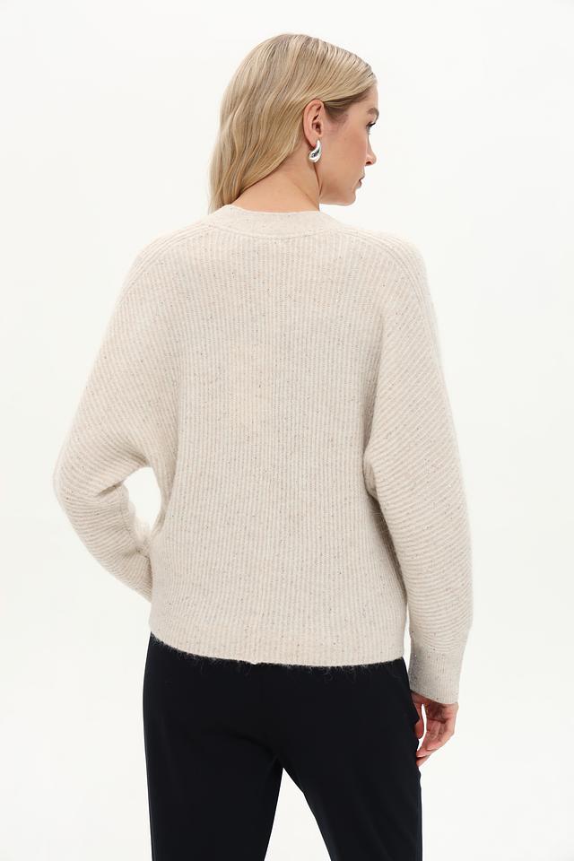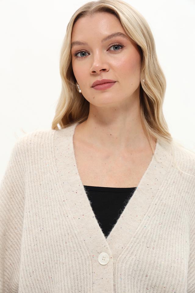 Модель имеет V-образный вырез и застёжку на пуговицы, что позволяет регулировать степень прилегания. Свободный крой обеспечивает комфорт в носке и позволяет сочетать жакет с различными предметами гардероба.