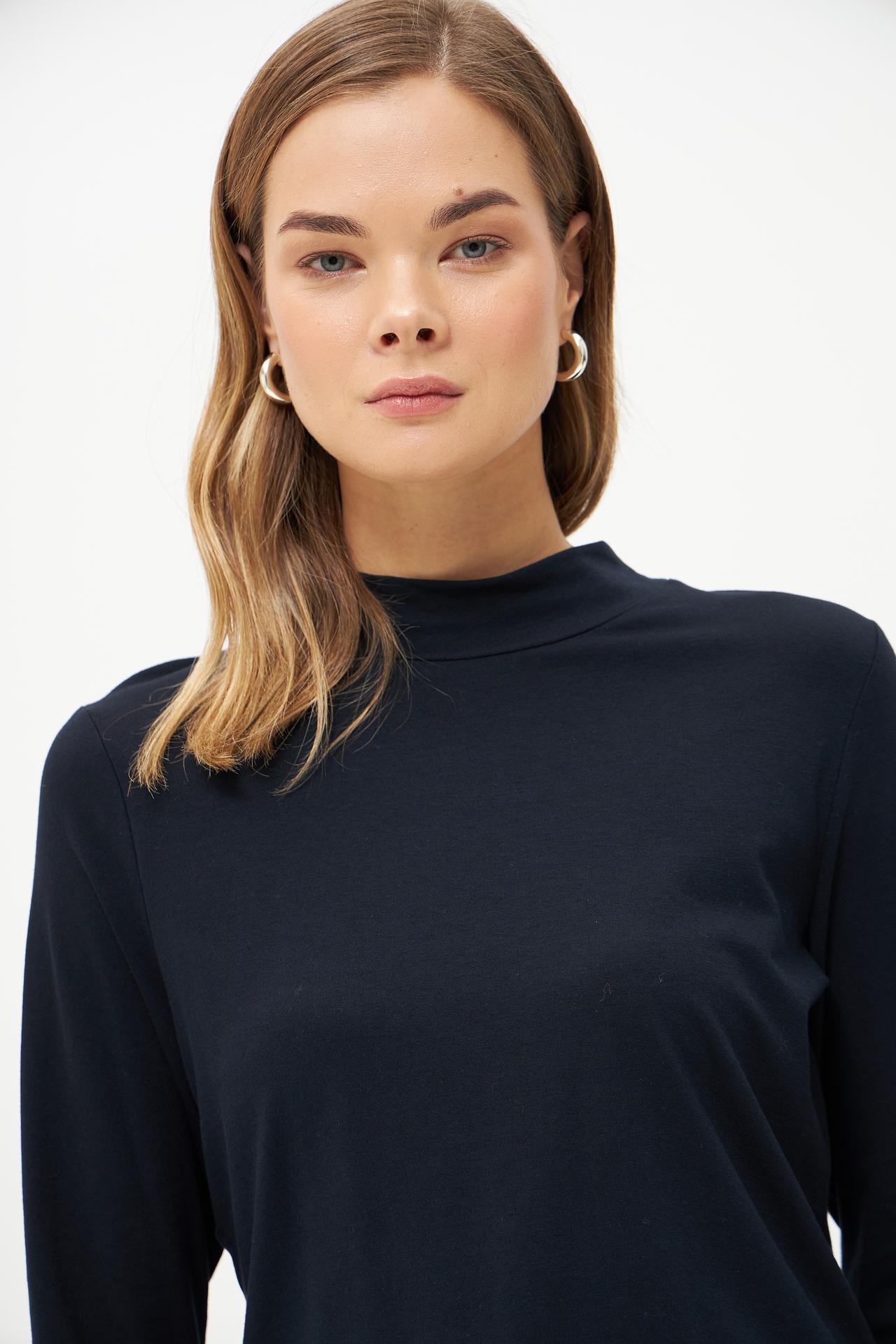 - Комфортная посадка: Пуловер имеет прямой силуэт, который деликатно облегает фигуру, не стесняя движений. Высокий воротник-стойка добавляет тепла и стильного акцента, делая его идеальным выбором для прохладной погоды.