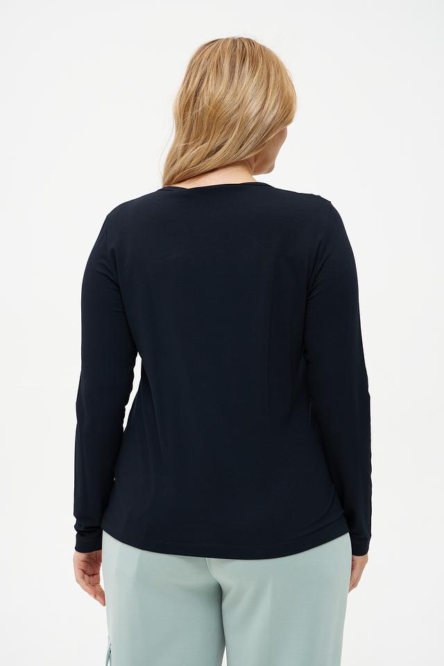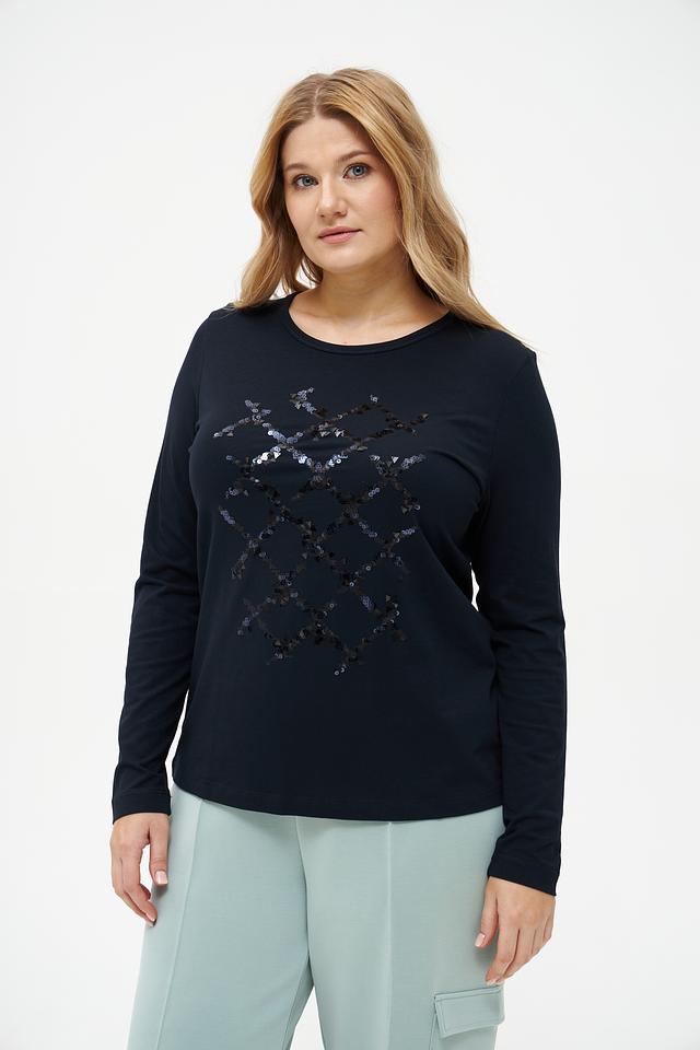 Модель имеет прямой крой и длинные рукава, что делает ее универсальной для разных сезонов. Особенностью футболки является декоративный узор из пайеток, расположенный на передней части, который придает образу изысканность и блеск.