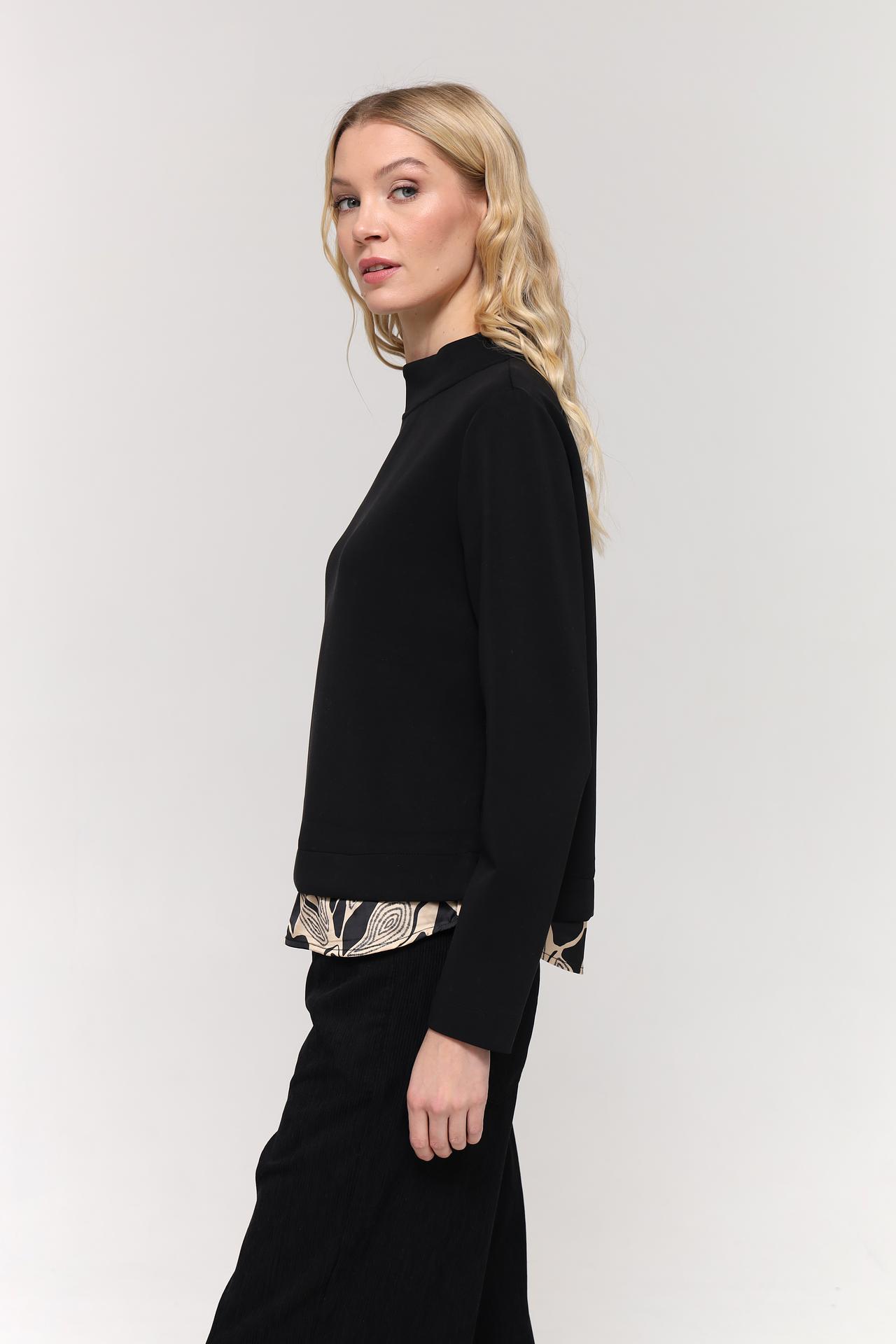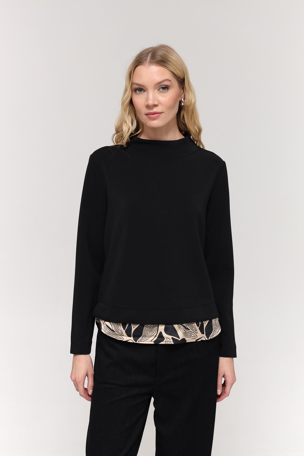 - Дизайн: Лаконичный чёрный пуловер с высоким воротником-стойкой. Нижняя часть изделия декорирована вставкой с контрастным абстрактным принтом, создавая эффект многослойности.