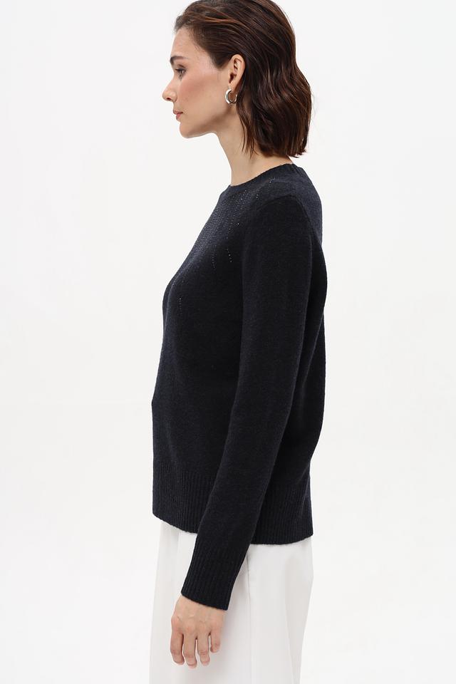 Пуловер имеет классический крой с круглым вырезом горловины и длинными рукавами. Особый акцент сделан на декоративной отделке в области плеч, выполненной в виде мелких страз, которые придают изделию изысканность и блеск.