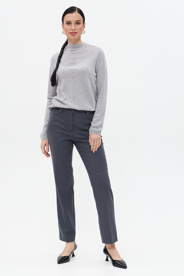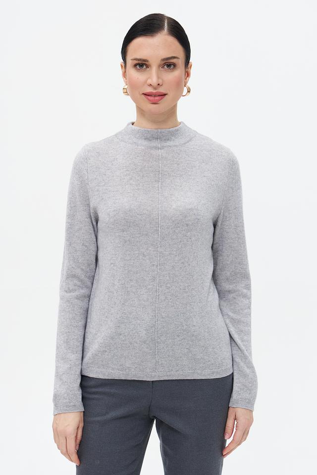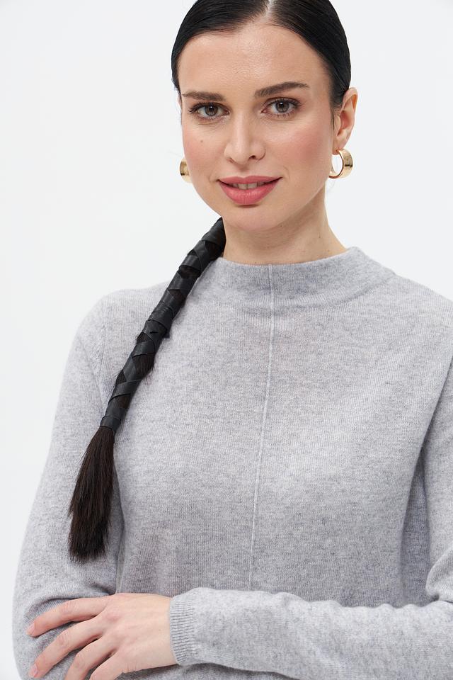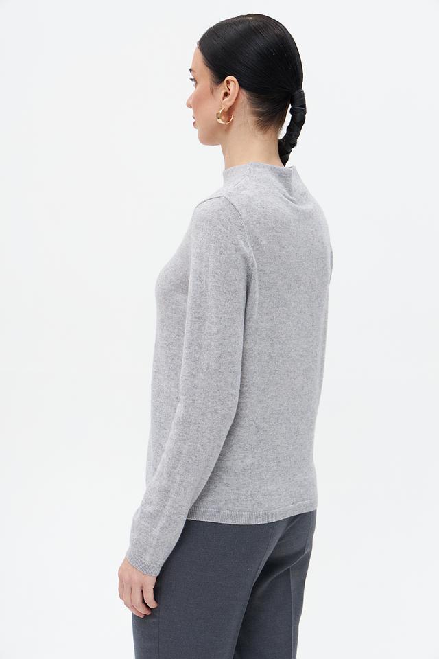 Пуловер имеет классический крой и спокойный серый цвет, который легко сочетается с различными элементами одежды. Высокий воротник-стойка добавляет изысканности образу. Деликатная текстура вязки подчеркивает качество изделия.