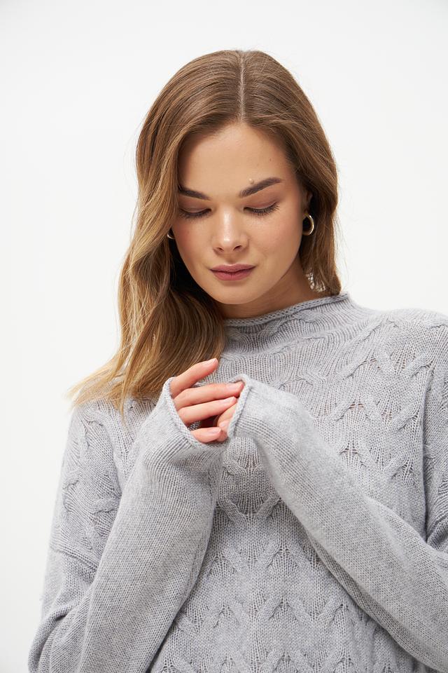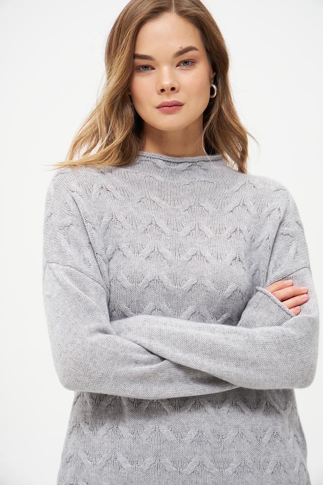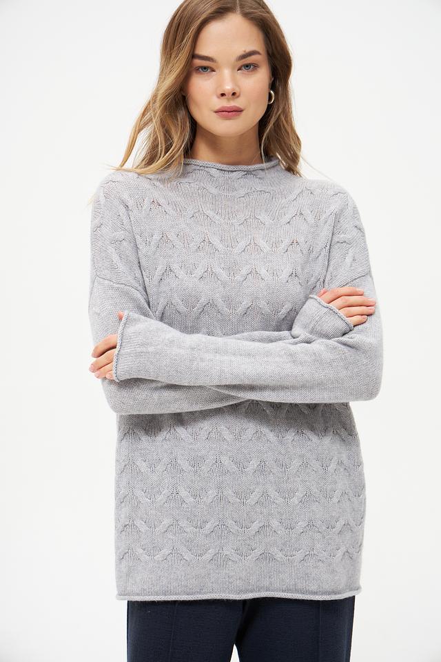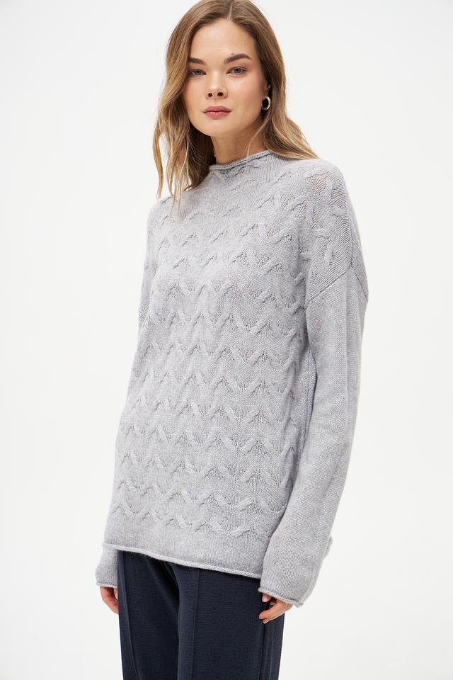 Пуловер имеет свободный крой, который не сковывает движения и позволяет создать расслабленный образ. Высокий воротник добавляет элегантности, а узор "косы" придает изделию оригинальность и текстуру.