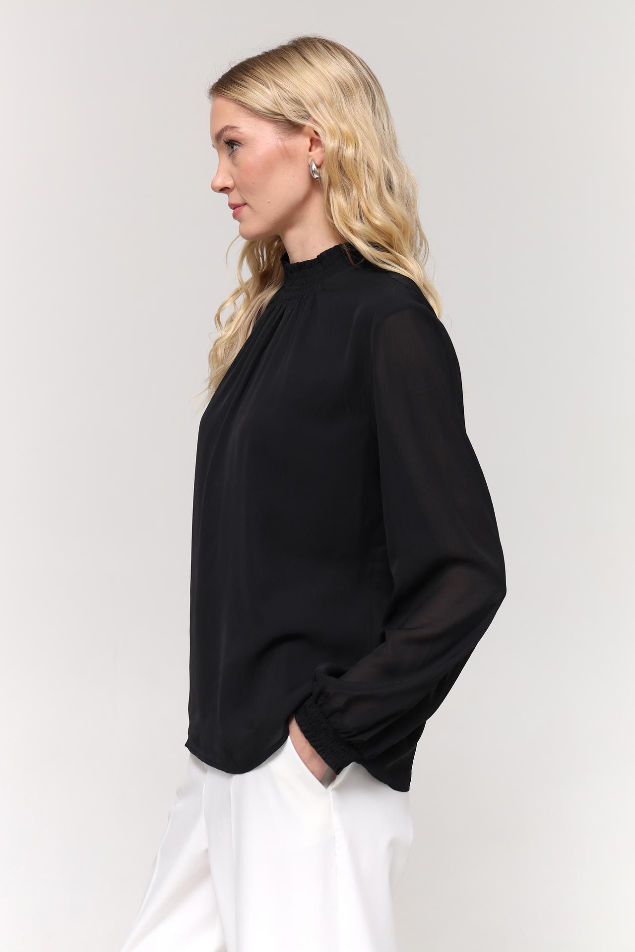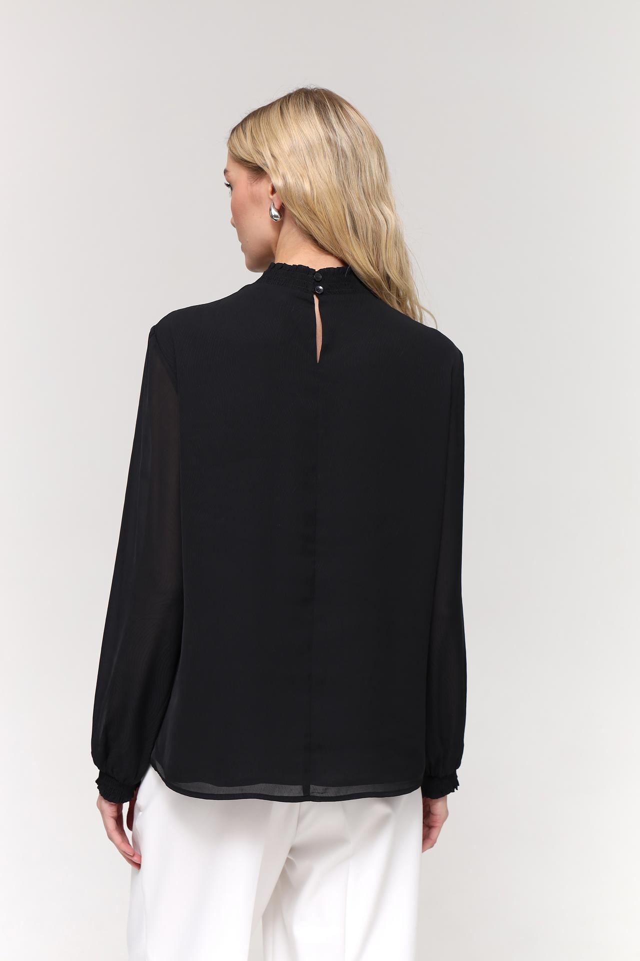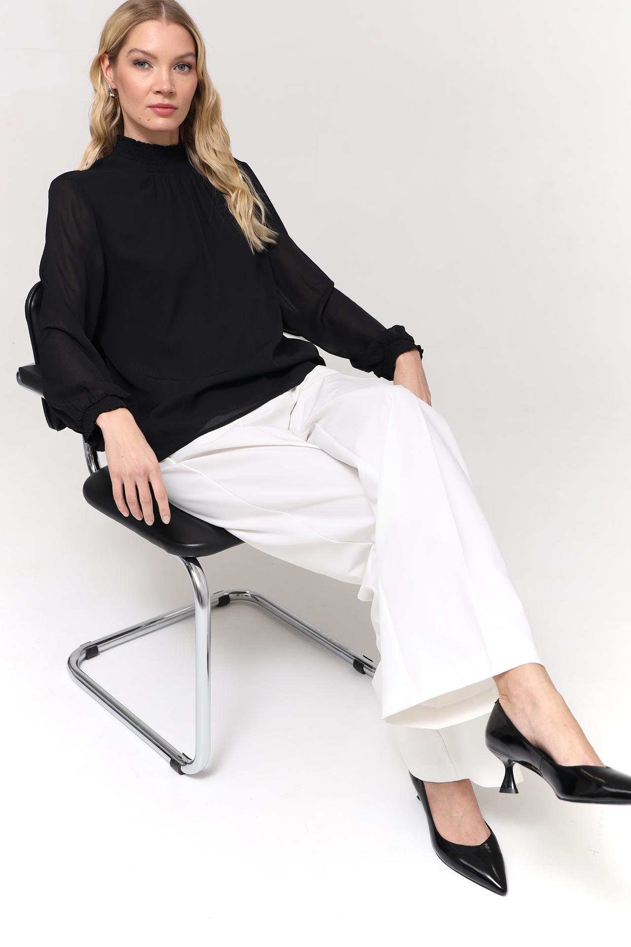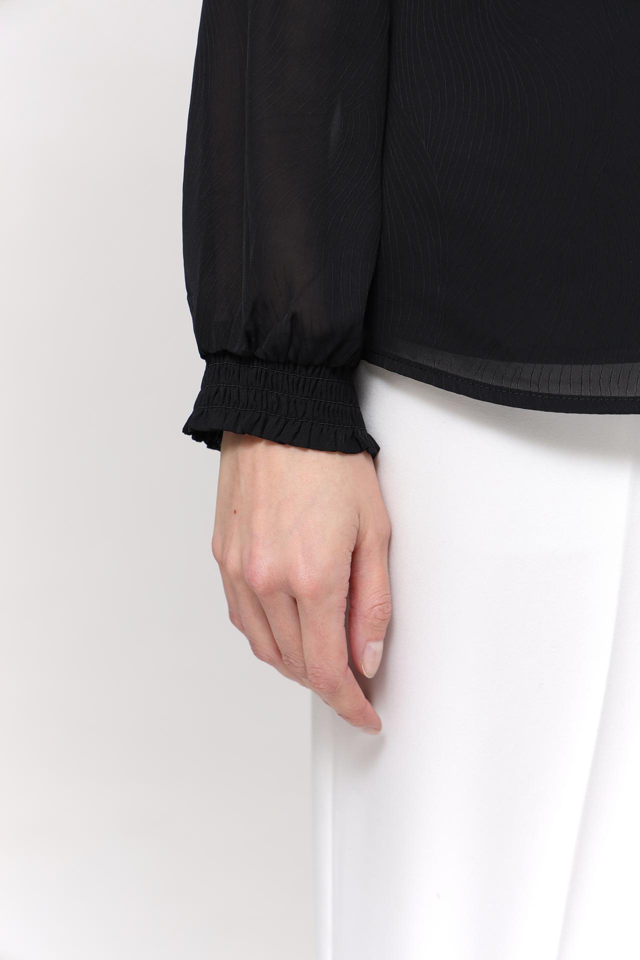 - Дизайн: Высокий воротник с деликатной сборкой и манжеты на резинке добавляют модели женственности и утонченности. Прозрачная ткань создает эффект воздушности.