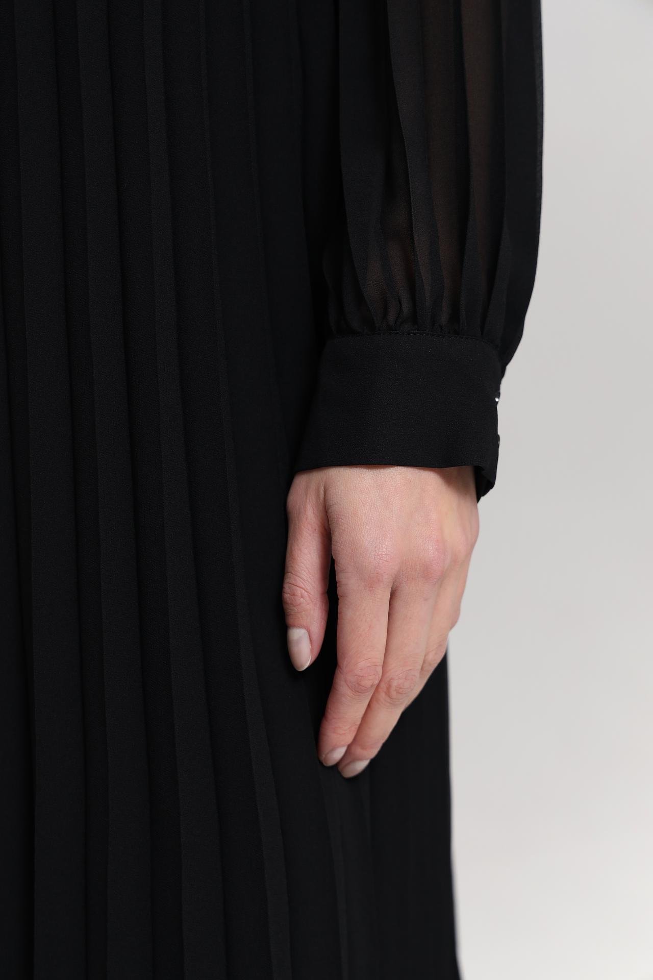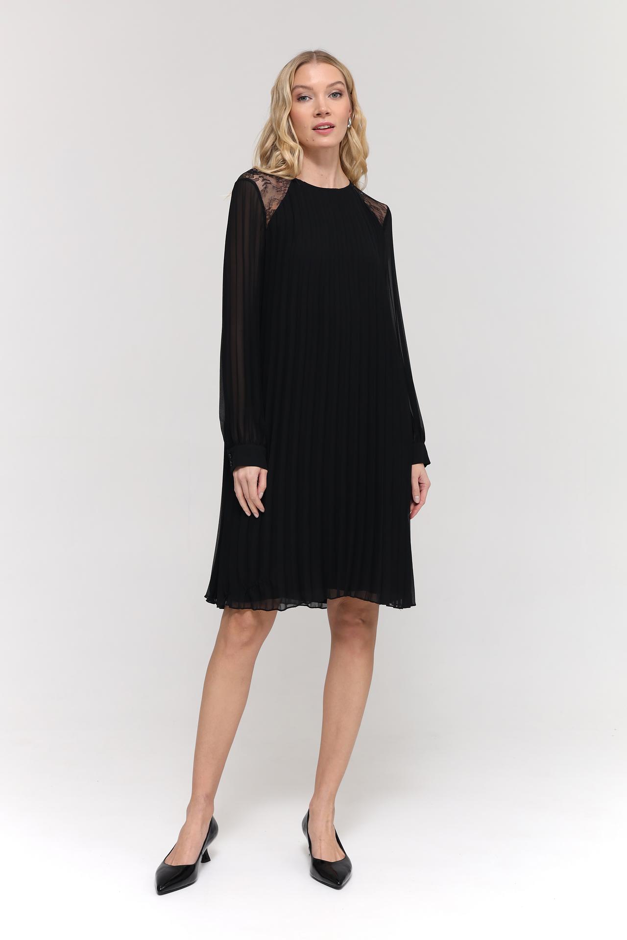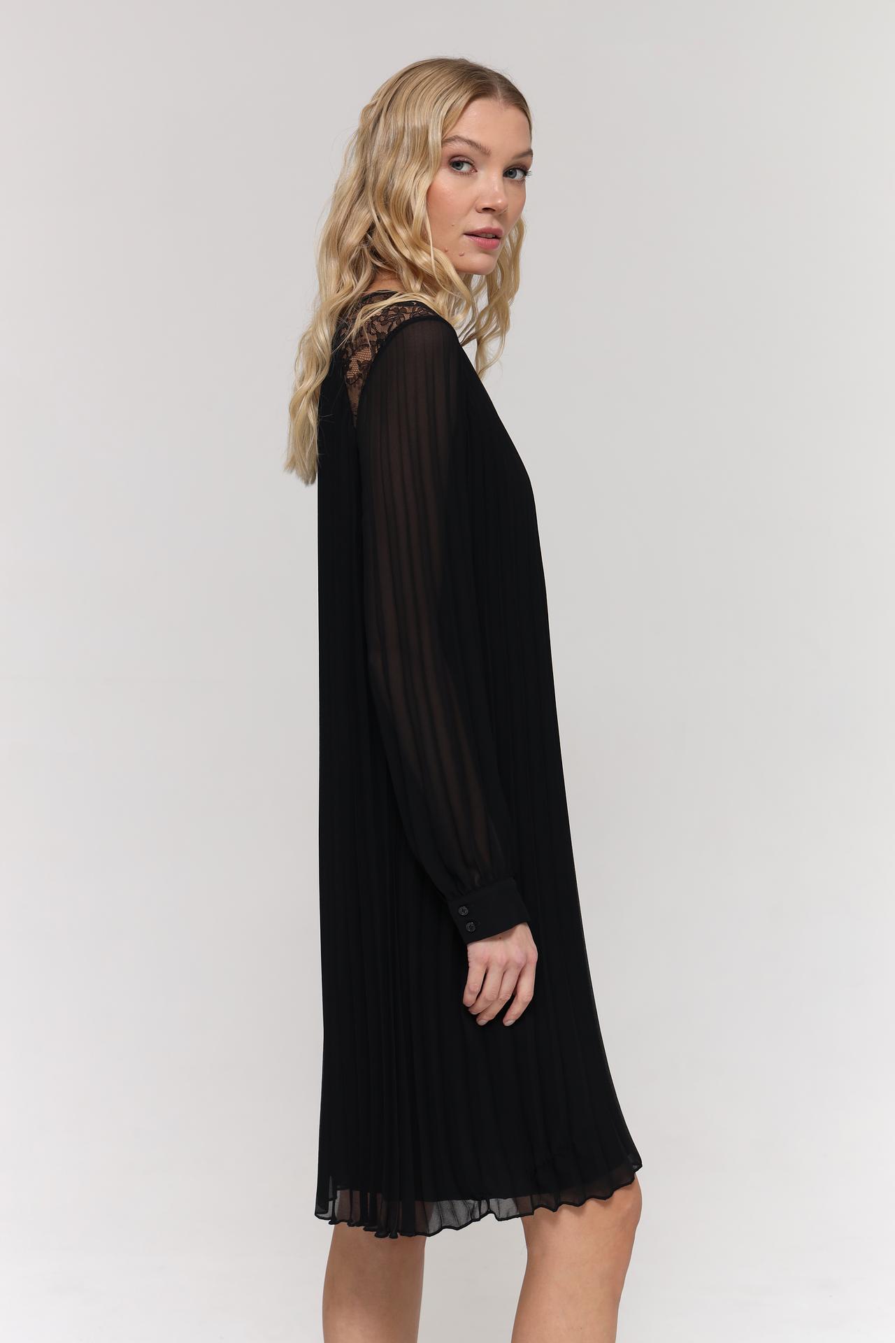 Элегантное платье от Gerry Weber, выполненное из 100% хлопка, станет идеальным дополнением вашего гардероба. Модель выполнена в классическом чёрном цвете и дополнена изысканным кружевом на плечах, придавая образу утонченность. Аккуратная плиссировка по всей длине платья добавляет ему динамики и воздушности. Длинные прозрачные рукава с манжетами на пуговицах завершают элегантный силуэт.