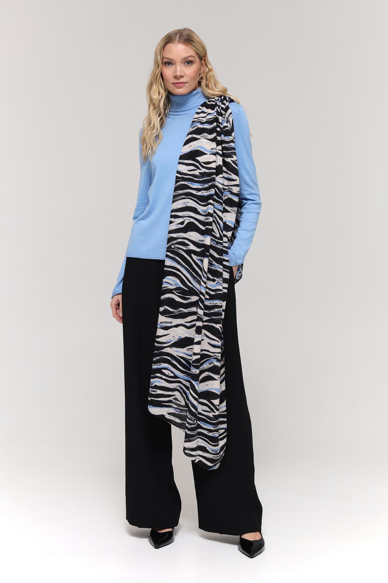 Элегантный шарф от Gerry Weber — стильный аксессуар, который добавит изюминку вашему образу. Оригинальный принт в стиле зебры, выполненный в классических черно-белых тонах с добавлением нежных голубых акцентов, подчеркнет вашу индивидуальность.