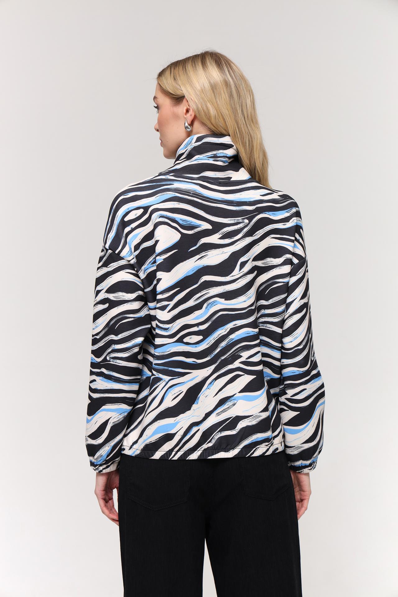 - Дизайн: Оригинальный черно-белый принт с голубыми элементами добавляет образу выразительности и индивидуальности.
