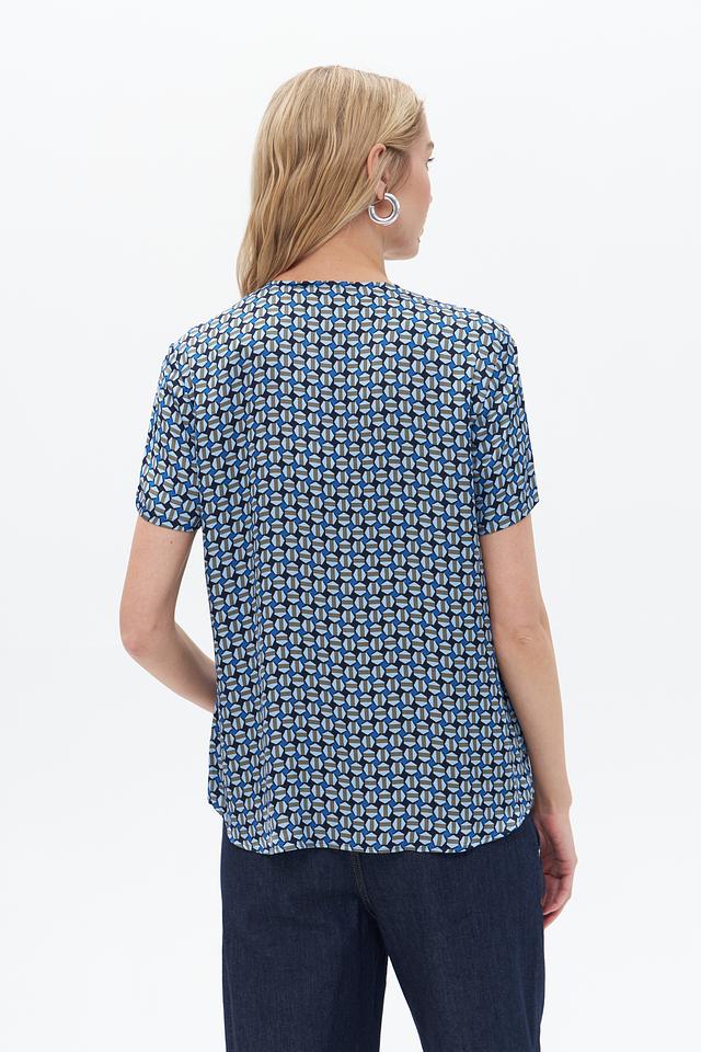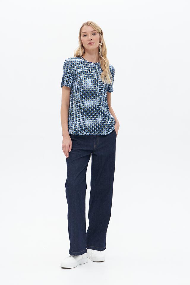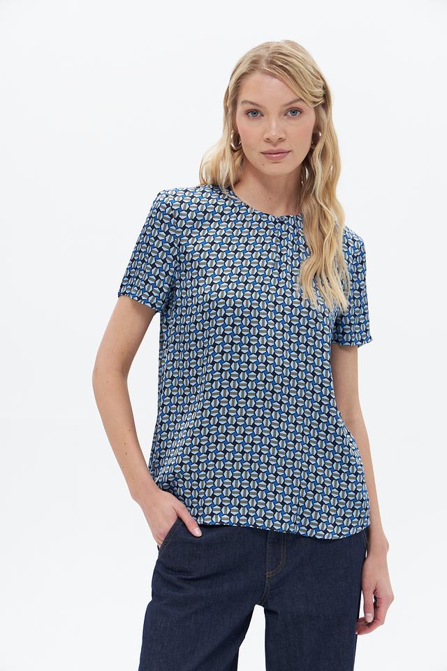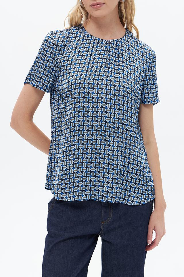 Особенностью данной модели является яркий геометрический принт в синих, белых и голубых тонах. Круглый вырез горловины и короткие рукава делают блузу идеальной для теплой погоды. Свободный крой обеспечивает свободу движений и комфорт при носке.