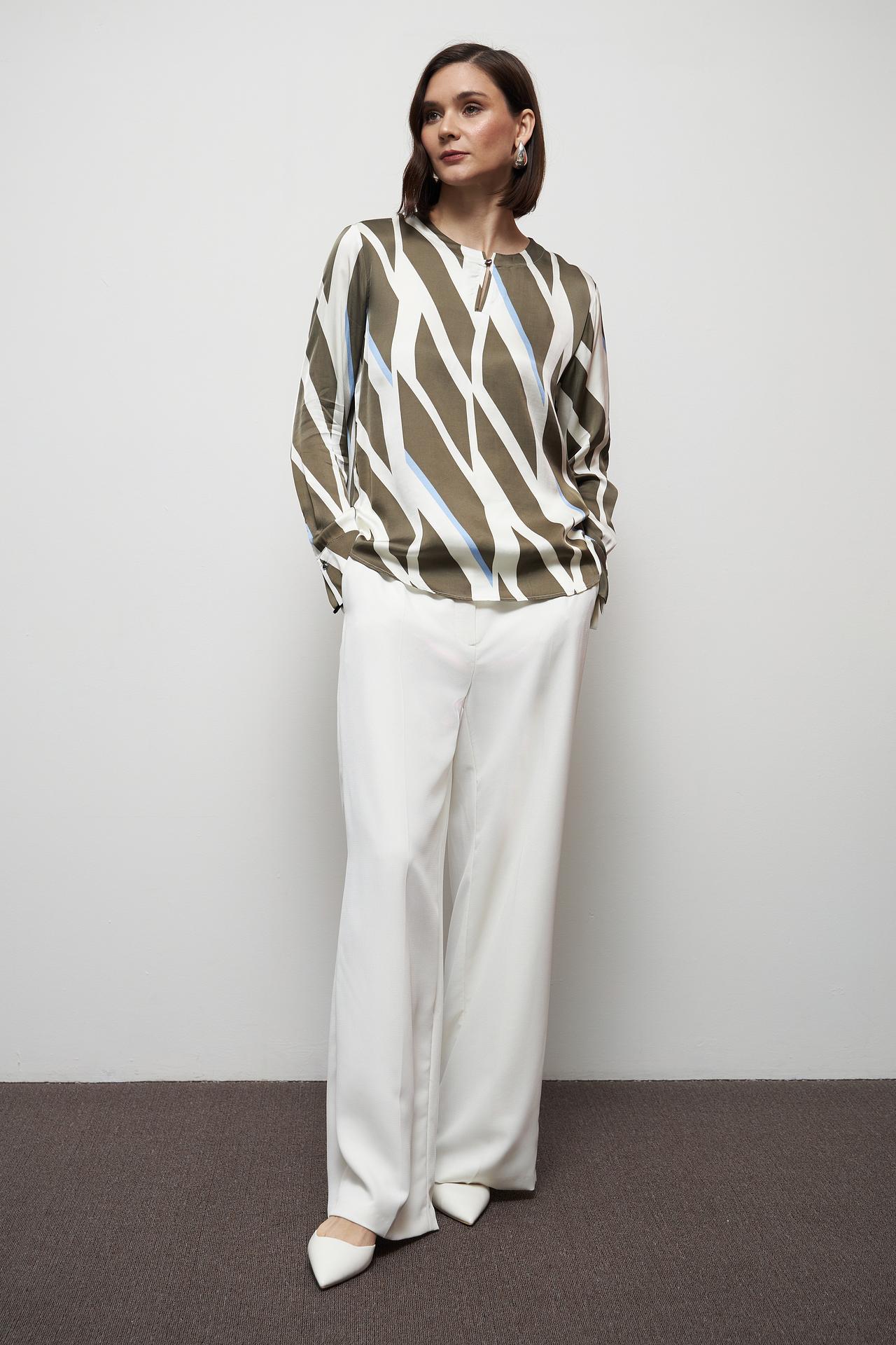 - Дизайн: Геометрический принт в модных оттенках хаки и белого придает блузе уникальность и современный вид.