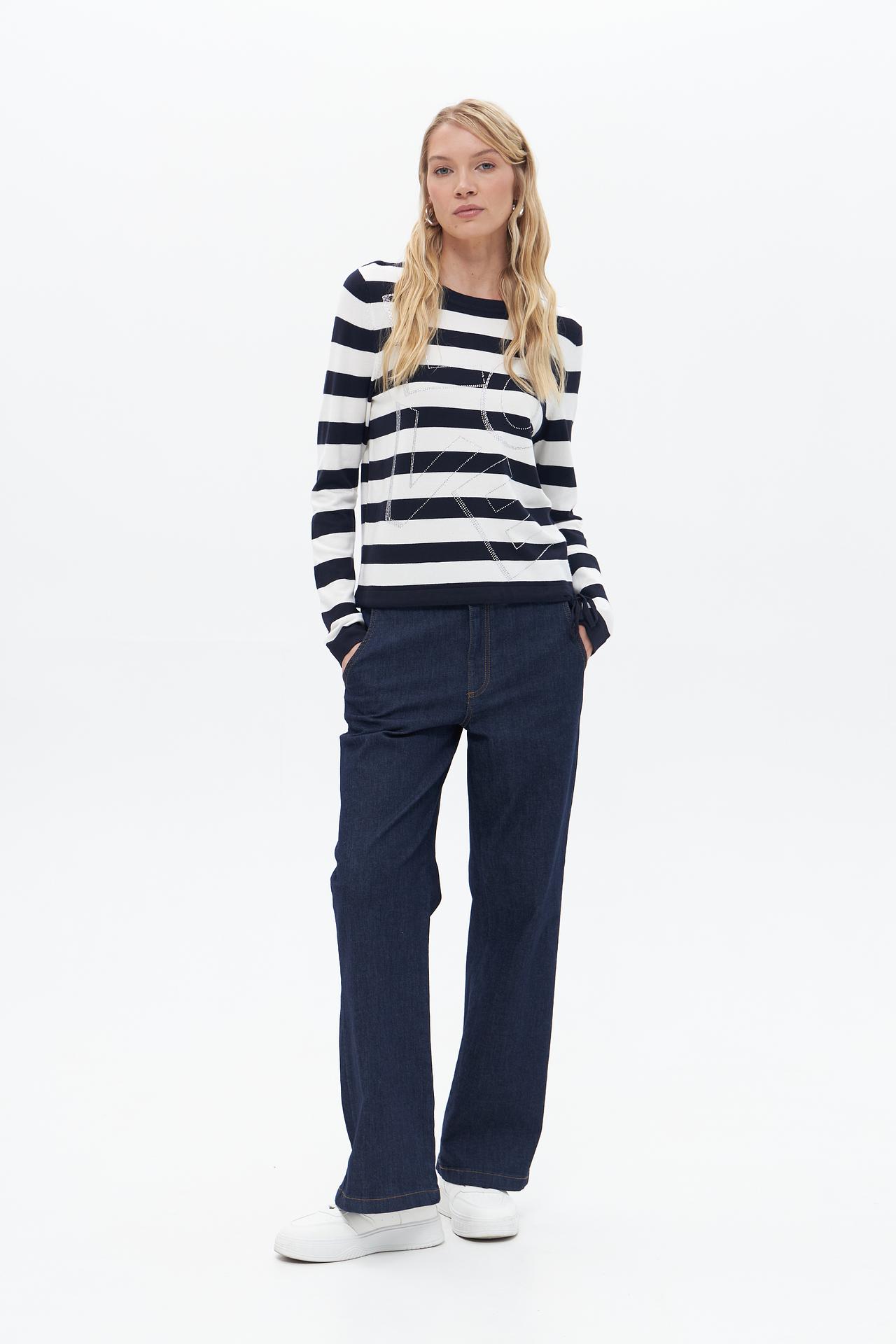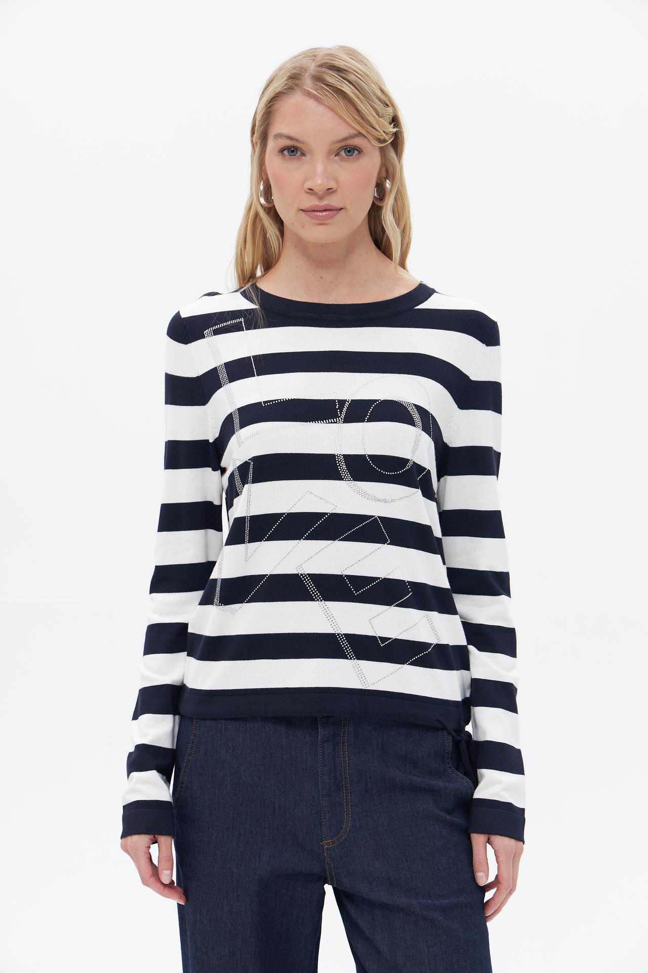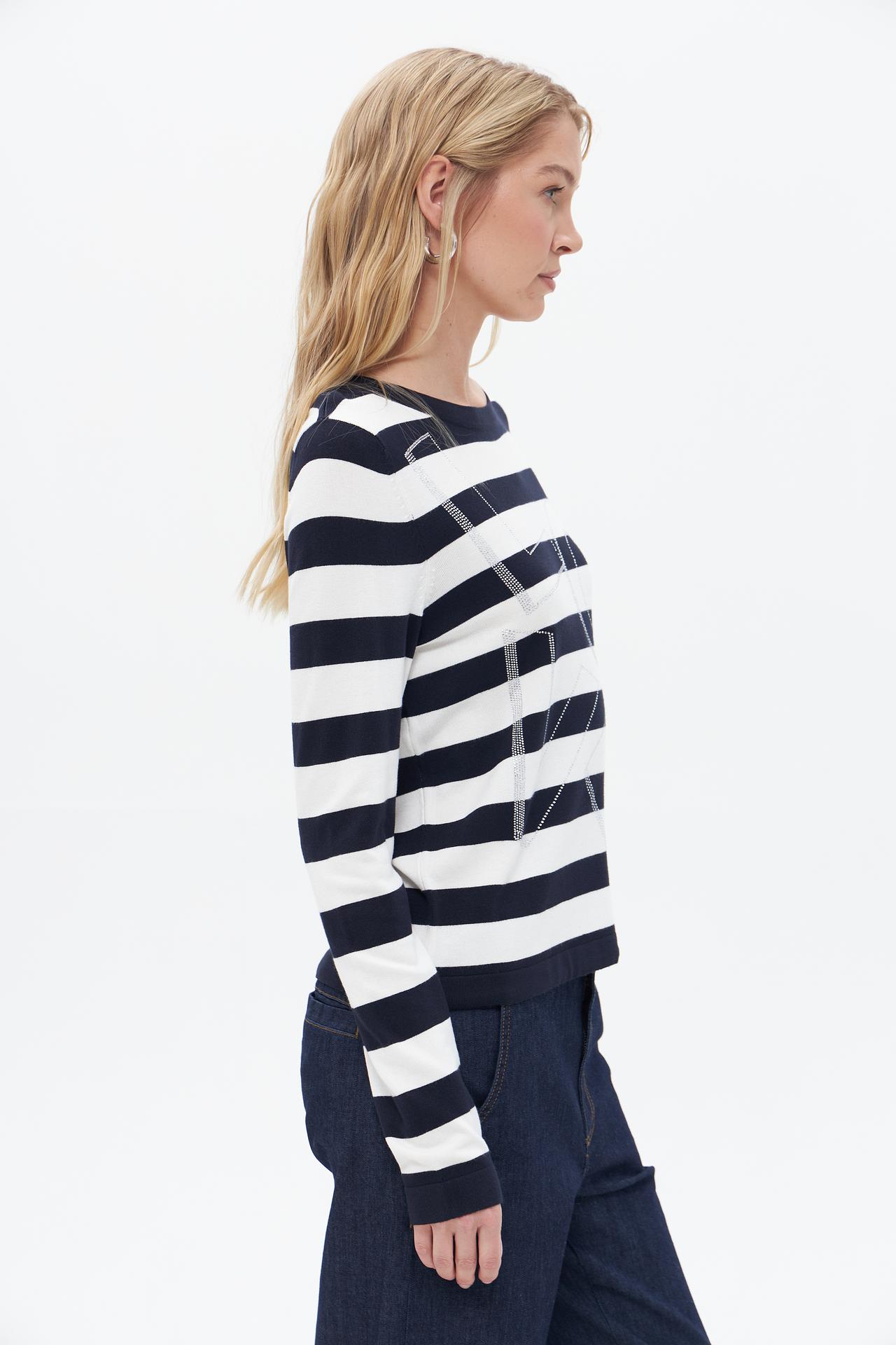 - Элегантный дизайн: Классическая полоска и оригинальный декор делают этот пуловер стильным и запоминающимся.