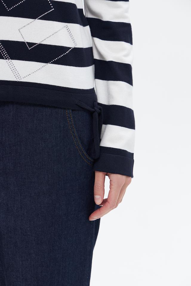 Женский пуловер Gerry Weber синего и белого цвета с полосатым узором и геометричным декором. Модель выполнена из мягкой вискозы с добавлением полиамида для большей износостойкости. Состав: вискоза 80%, полиамид 20%