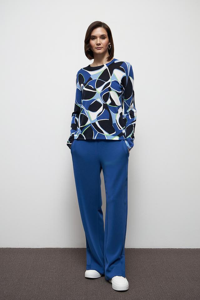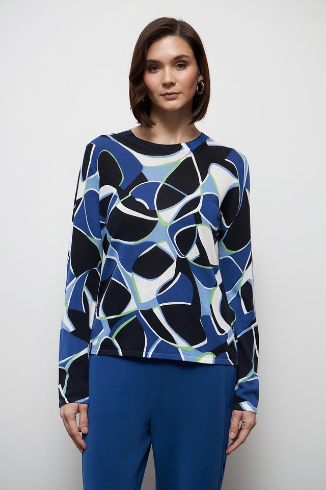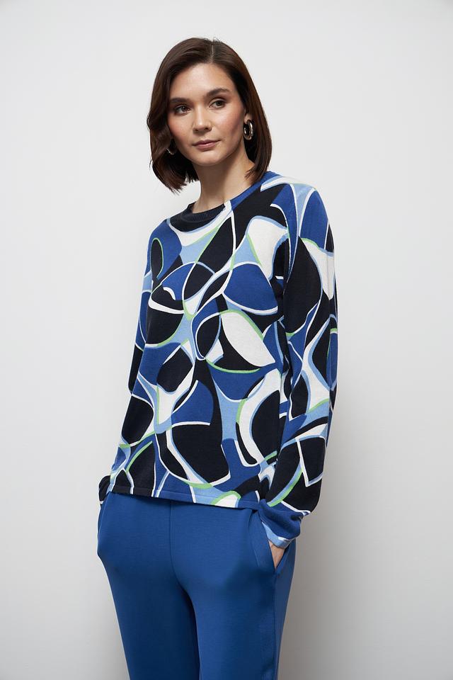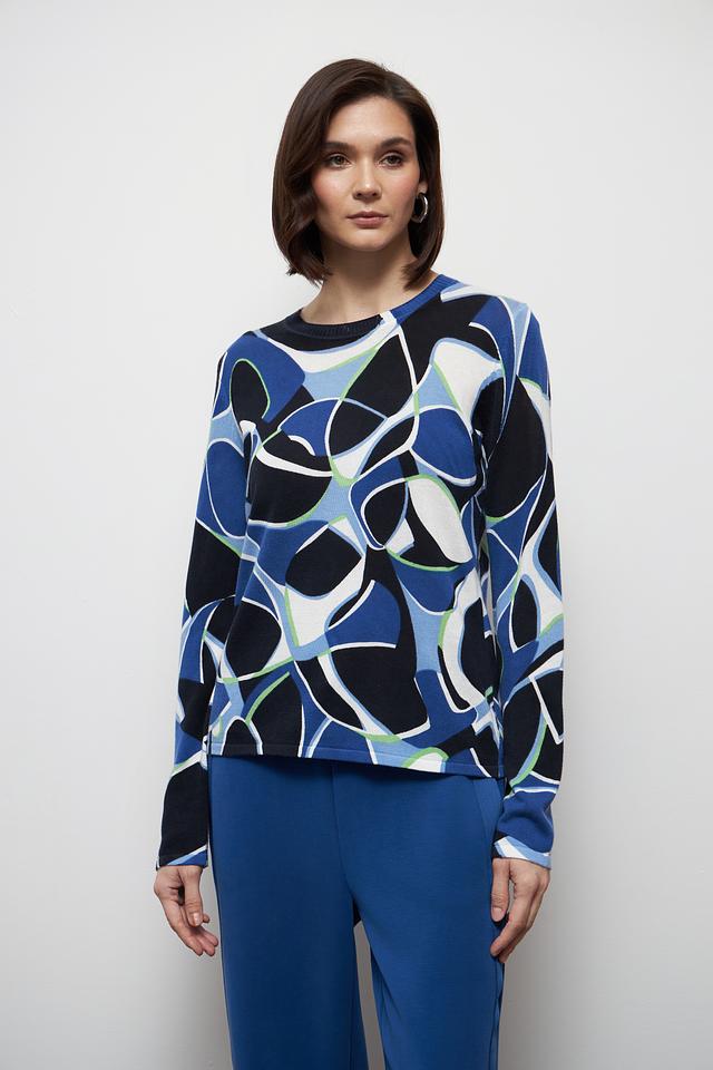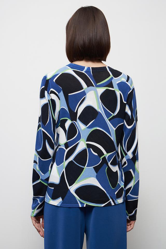 Пуловер имеет свободный крой и круглый вырез горловины, что делает его универсальным и подходящим для различных образов. Главной особенностью модели является яркий и необычный абстрактный принт, выполненный в синих, голубых и зелёных тонах. Этот принт добавляет изделию оригинальности и привлекает внимание.