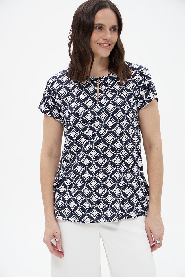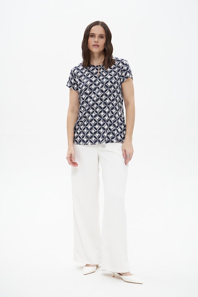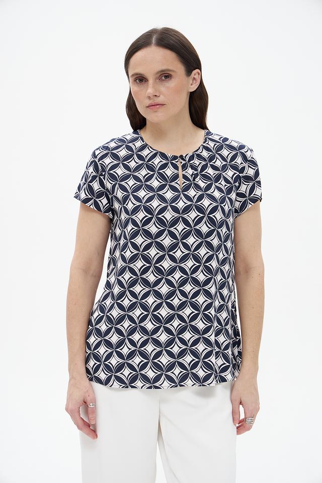 Блузка имеет прямой крой и короткие рукава, что делает ее удобной и практичной для повседневной носки. Вырез горловины оформлен небольшим разрезом, добавляющим образу изысканности.