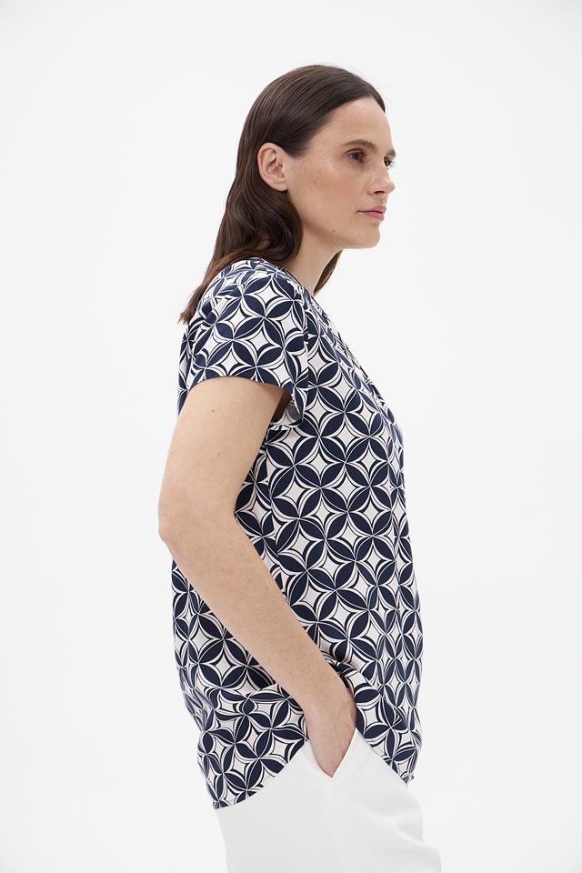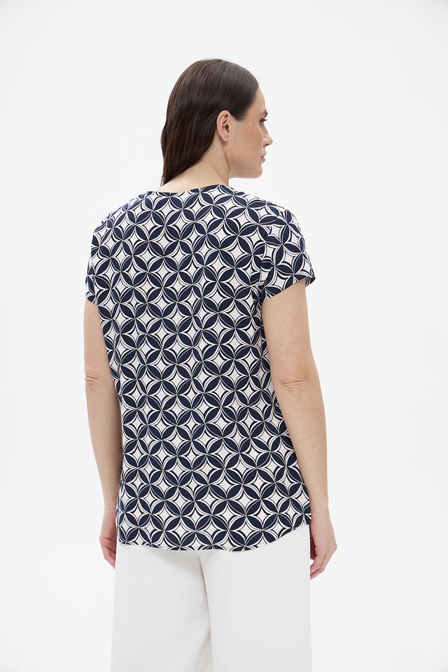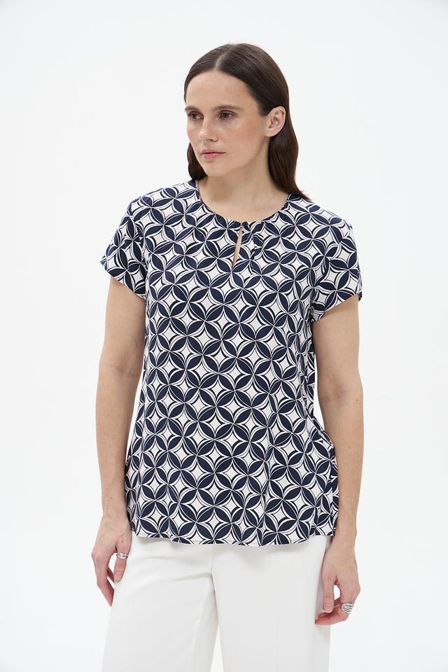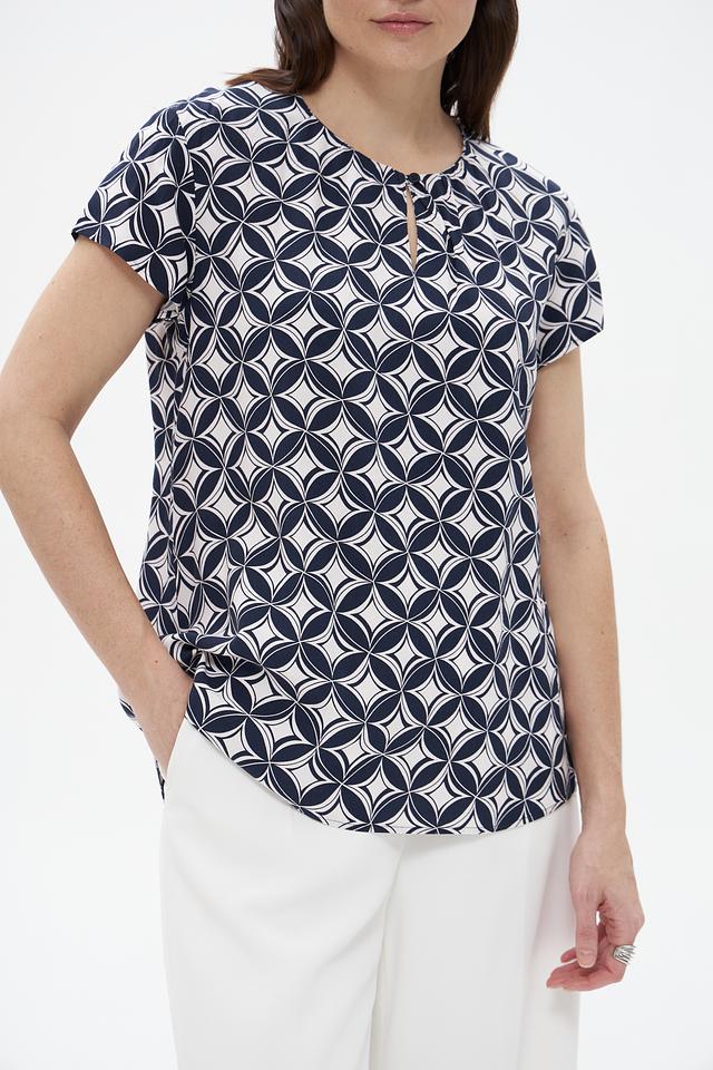 Блузка Gerry Weber синего цвета с геометрическим принтом. Изготовлена из 100% вискозы, обеспечивающей комфорт и лёгкость в носке. Идеальный выбор для создания стильного и элегантного образа. Состав: вискоза 100%