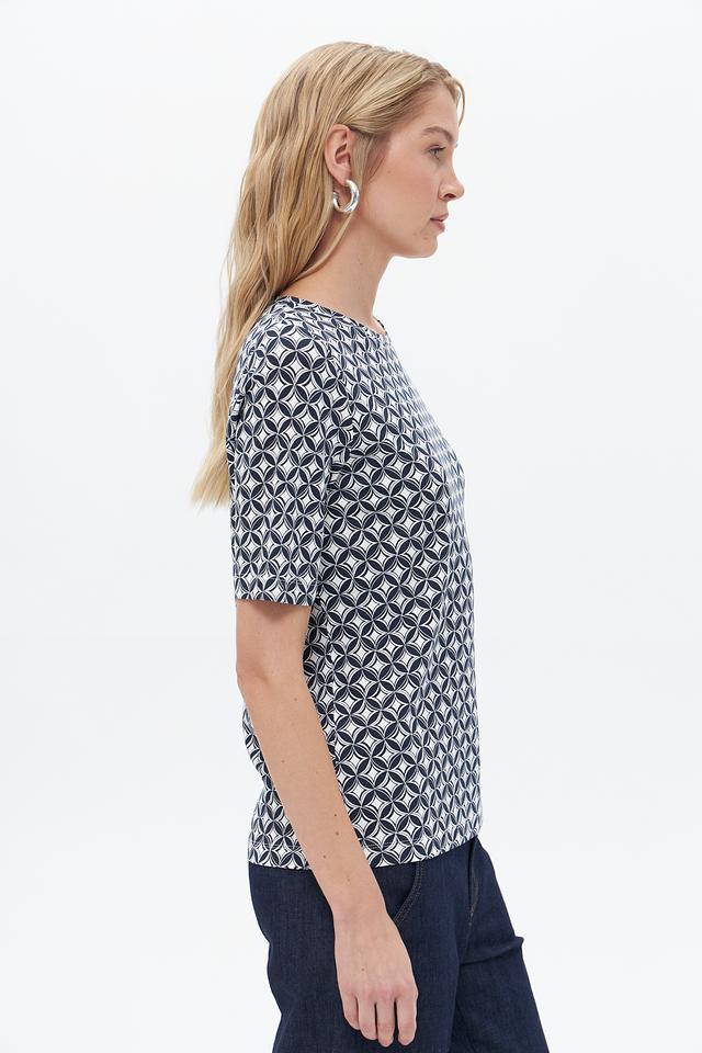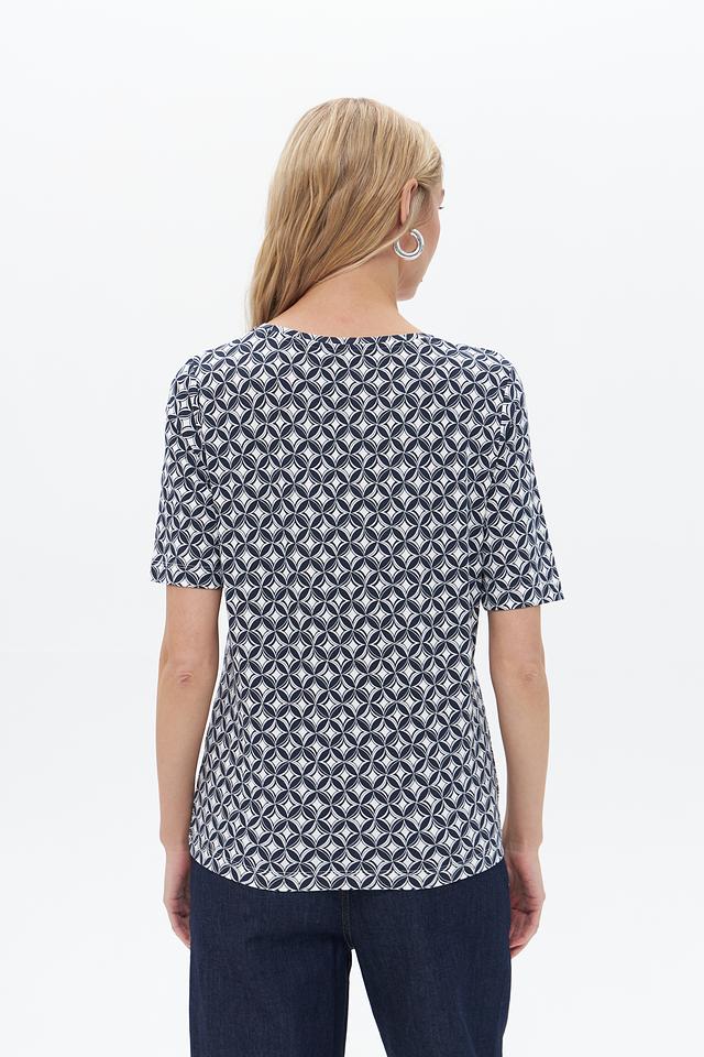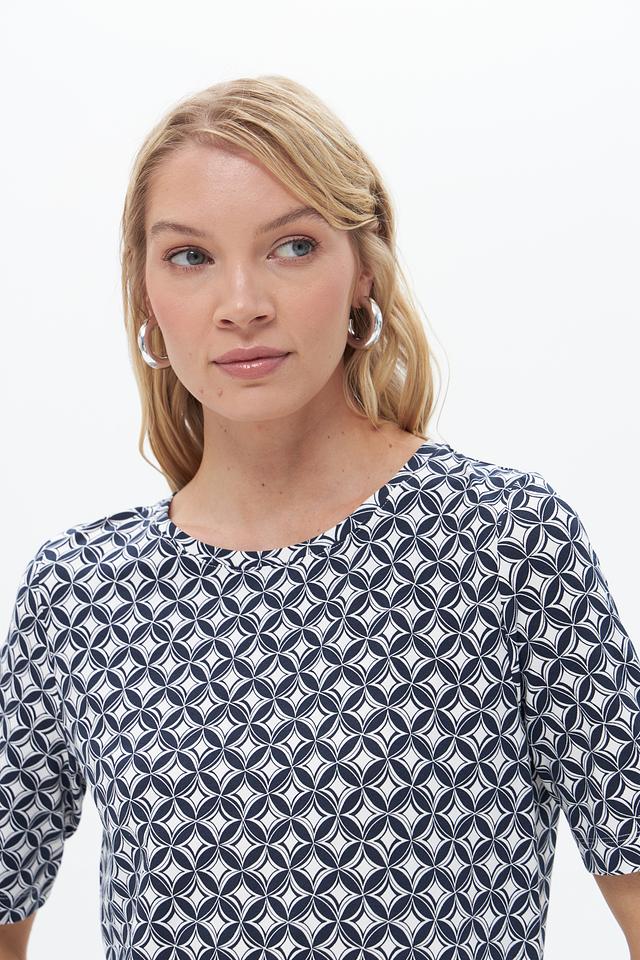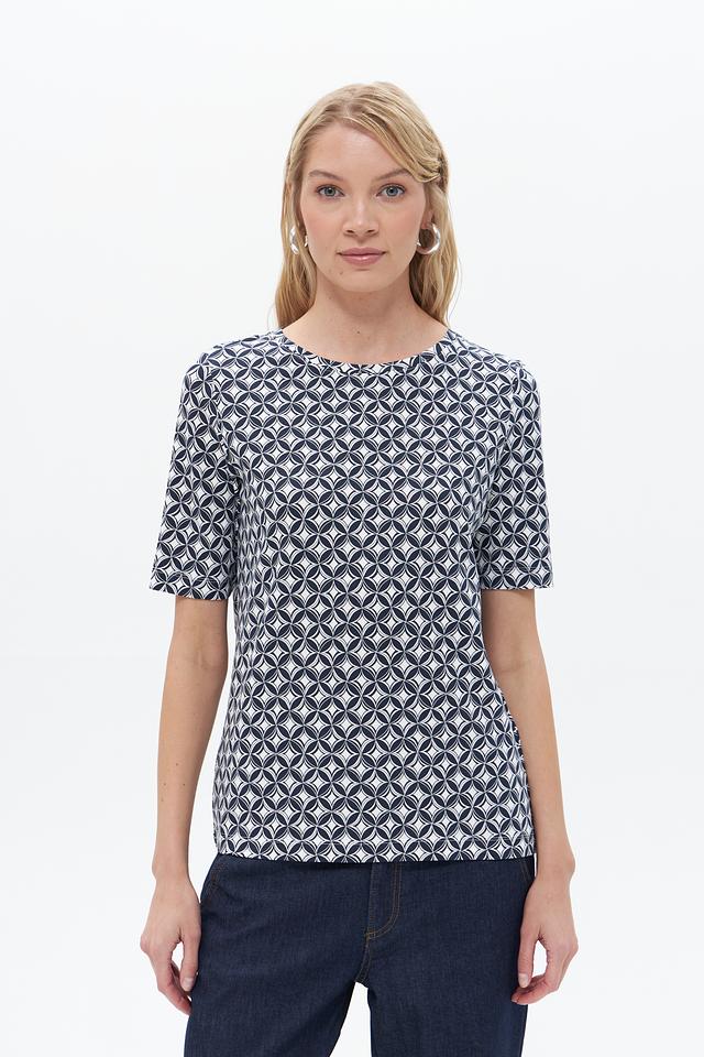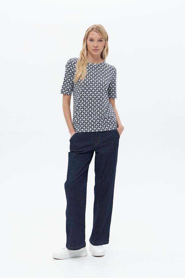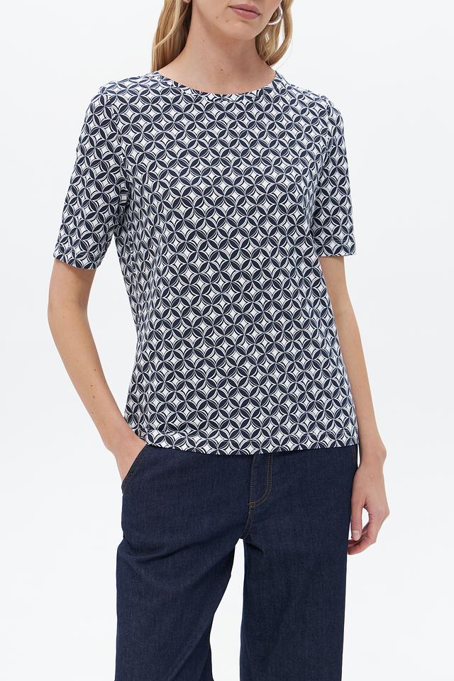 Женская футболка Gerry Weber синего цвета с геометрическим принтом. Изготовлена из мягкого хлопка с добавлением модала и эластана для комфорта и хорошей посадки. Состав: хлопок 47%, модал 47%, эластан 6%