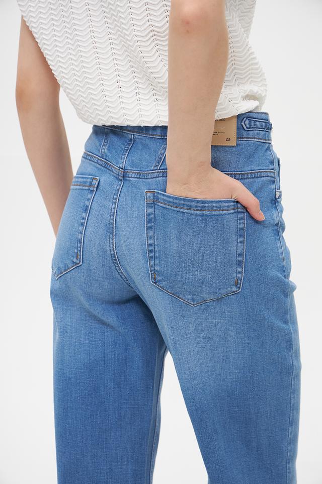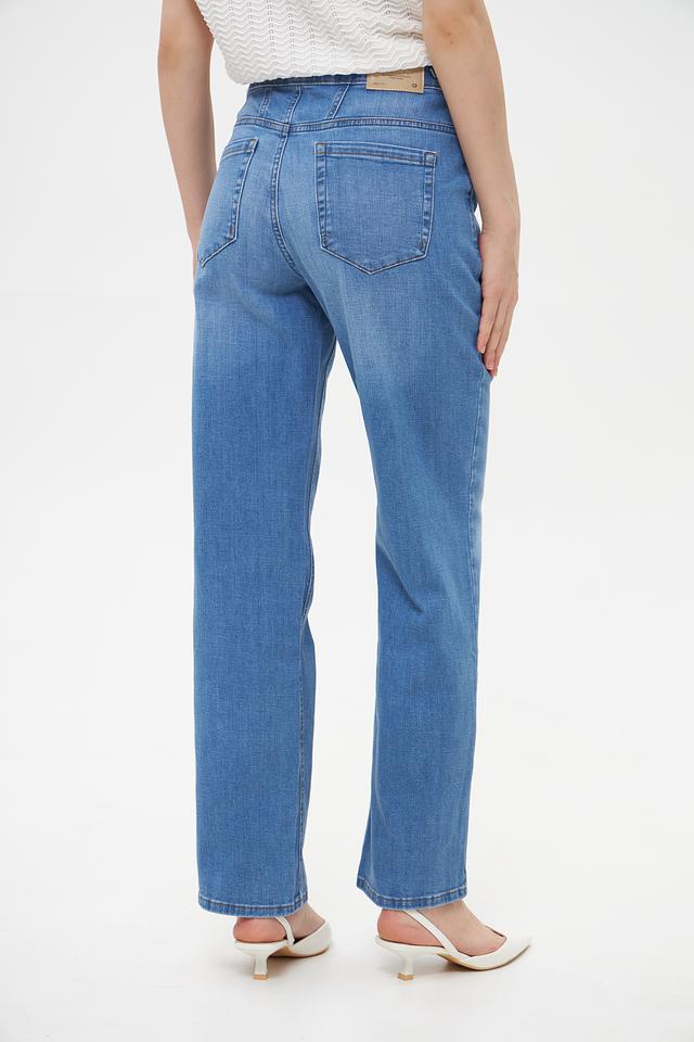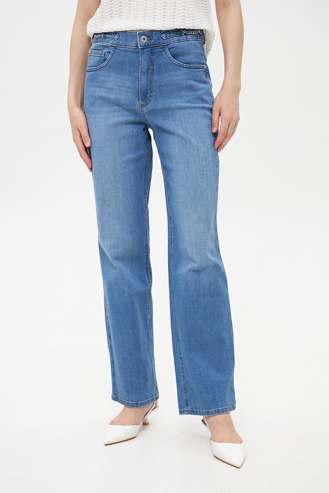 Джинсы имеют традиционный пятикарманный дизайн и оформлены декоративной цепочкой на поясе, придающей образу изюминку. Прямой крой обеспечивает свободу движений и подходит для любого типа фигуры.