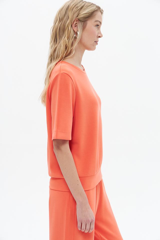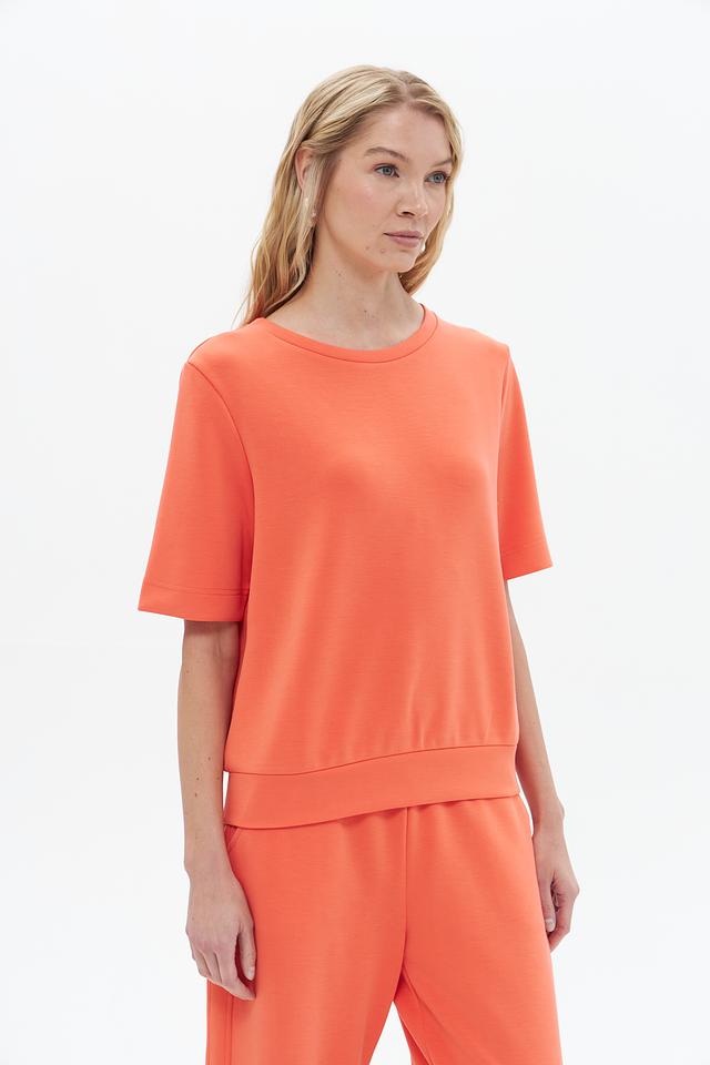 Пуловер имеет прямой крой и круглый вырез горловины. Короткие рукава делают его идеальным для теплой погоды. Мягкий трикотаж обеспечивает комфорт при носке, а добавление эластана придает изделию небольшую эластичность, позволяя ему хорошо сидеть по фигуре.