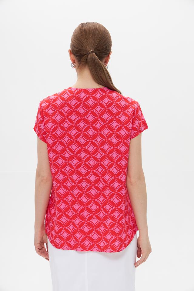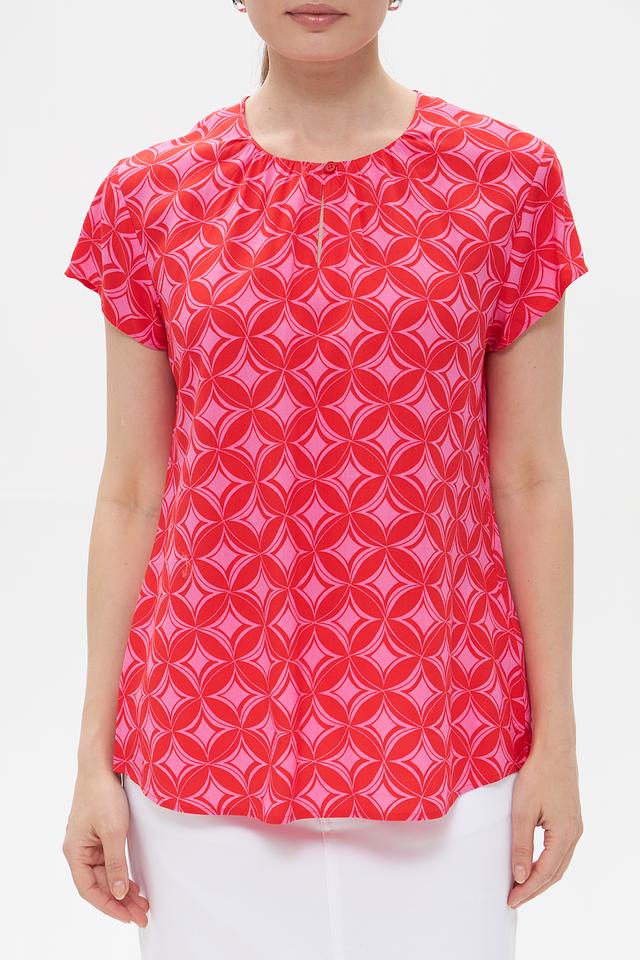 Блузка имеет яркий геометрический принт в розово-красной гамме, который добавит образу оригинальности. Короткие рукава и круглый вырез горловины делают её идеальной для теплой погоды.