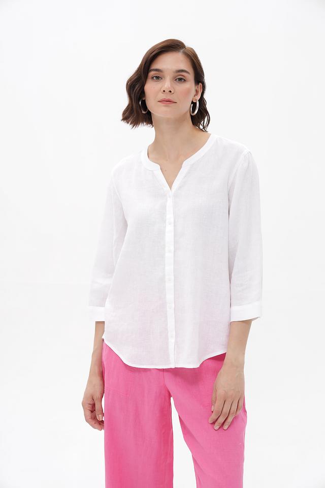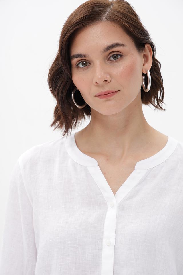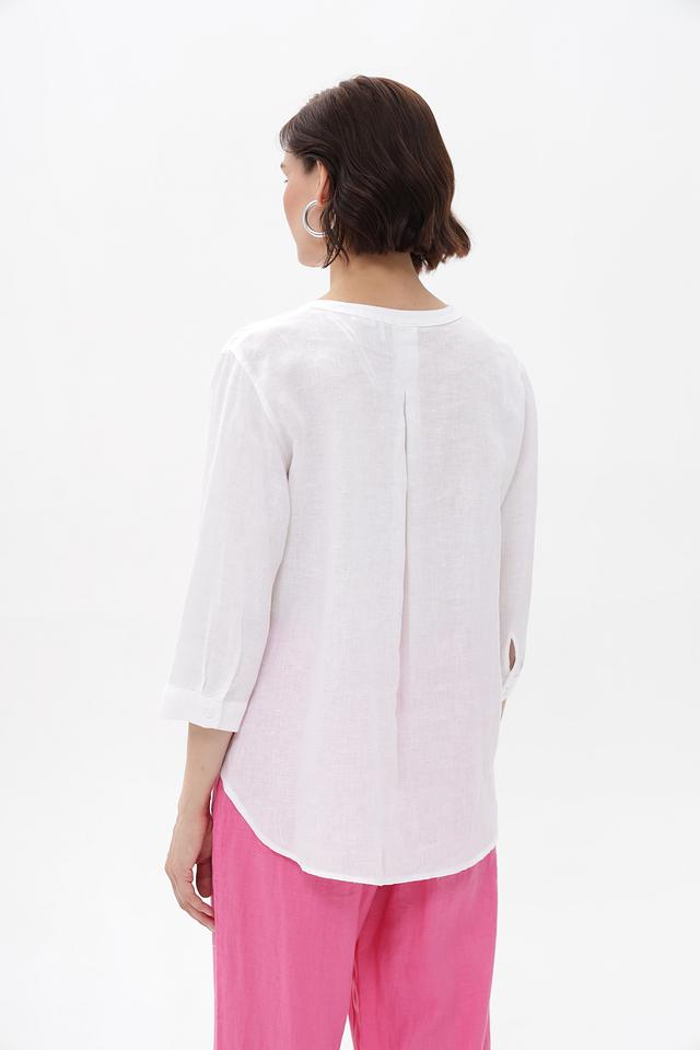 Полупрозрачная фактура льна добавляет блузке лёгкости и воздушности. Эта модель станет отличным дополнением к вашему летнему гардеробу, сочетаясь с брюками, юбками или шортами.