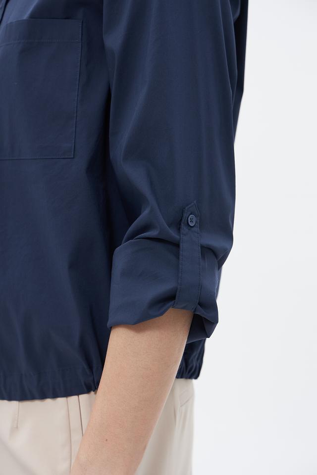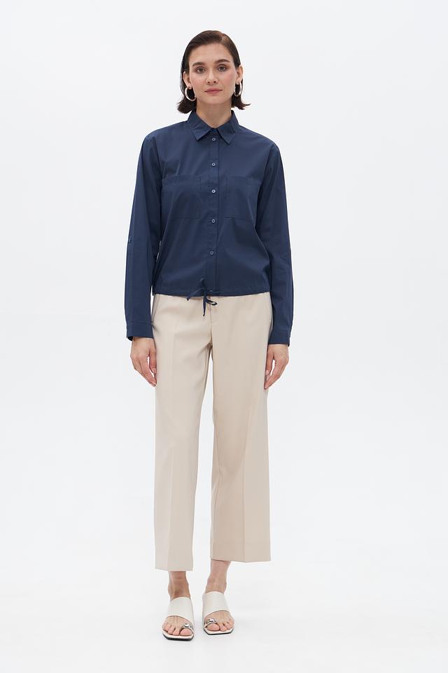 Блузка имеет классический крой с длинными рукавами и воротником. На полочке расположены накладные карманы, добавляющие образу непринужденности. Боковые завязки позволяют регулировать посадку по фигуре, подчеркивая талию.