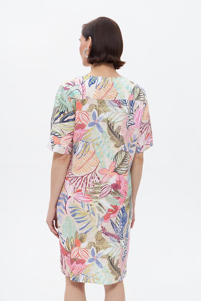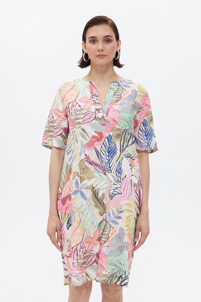 Платье имеет яркий цветочный принт, который придает ему женственности и очарования. V-образный вырез и короткие рукава делают его идеальным для теплых дней. Свободный крой обеспечивает комфорт и свободу движений.